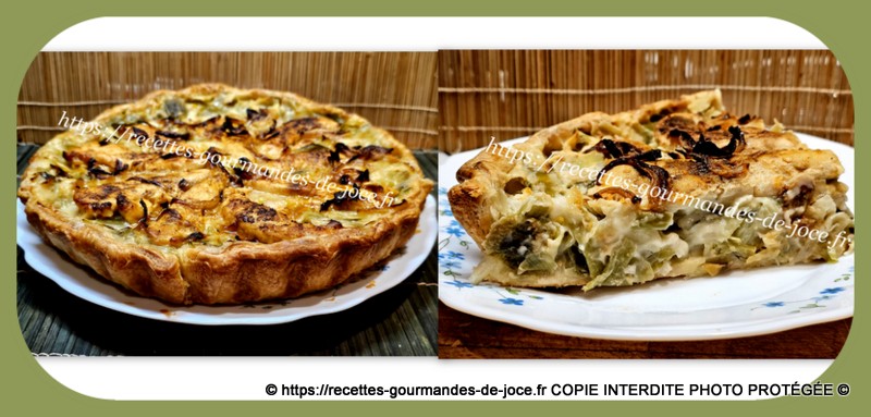 Tarte aux poireaux et aux aiguillettes de poulet épicées.