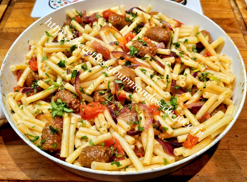 Macaronis aux merguez et aux tomates.