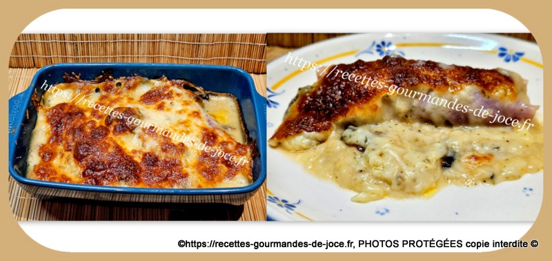 Gratin d’endives braisées aux deux jambons, champignons persillés et sauce au bouillon de volaille.