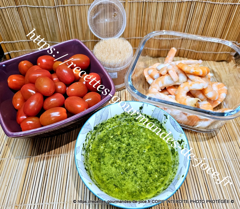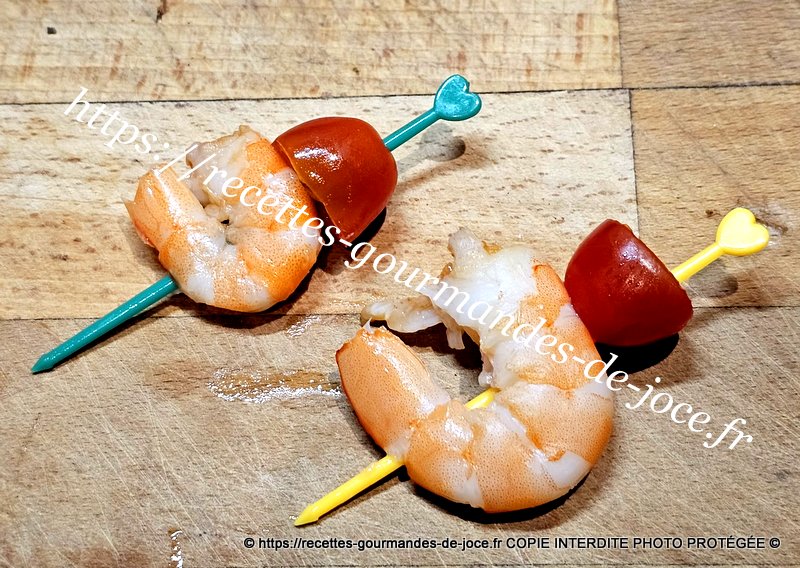 Décortiquer les crevettes, laver et couper les tomates en deux, sur un pique mettre une ½ tomate puis une crevette.