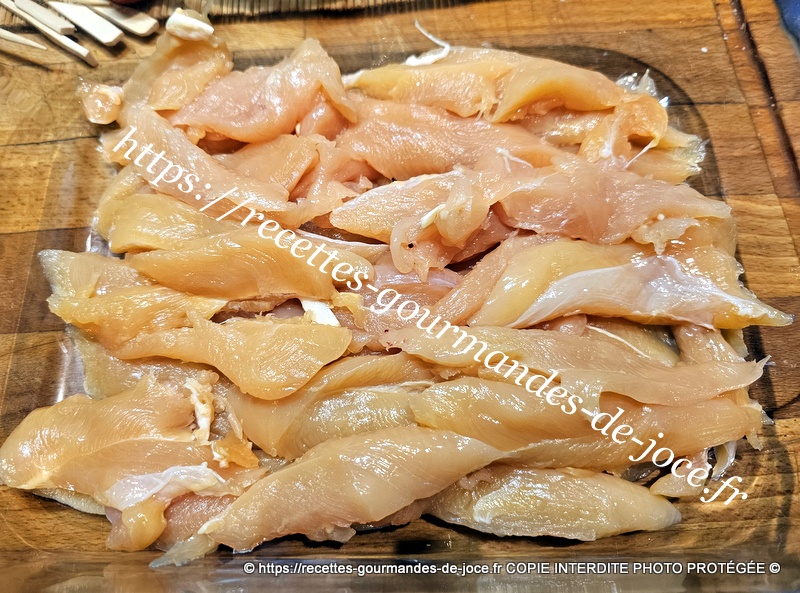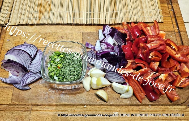 Trancher les aiguillettes de poulet en fines lanières, les déposer dans un plat. Laver, égrainer et couper les poivrons en morceaux, peler et couper grossièrement 1 oignon rouge et les gousses d’ail dégermées, peler et émincer le 2 -ème oignon. (Je ne me suis pas servie de la persillade)