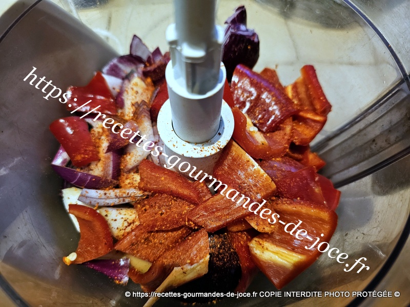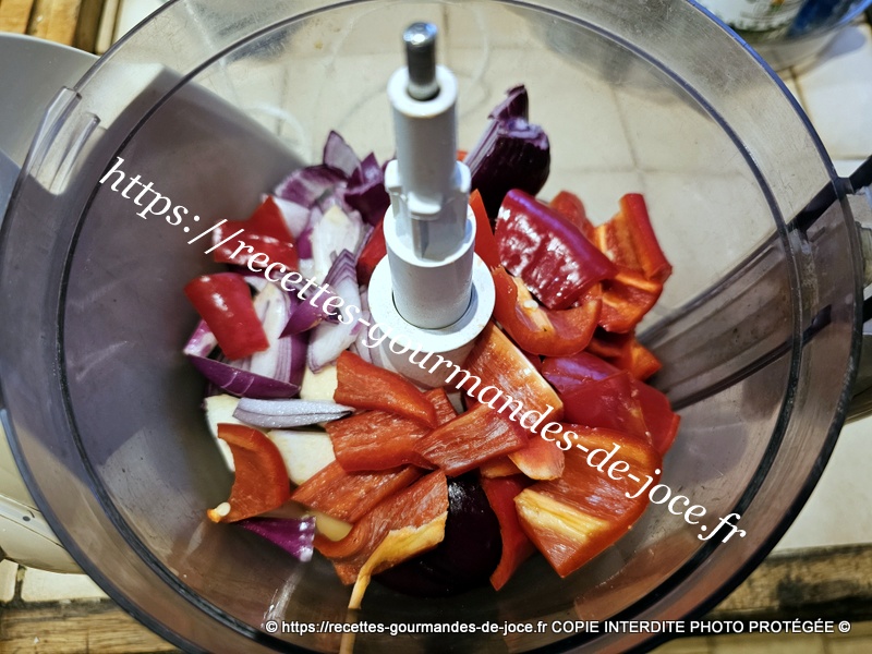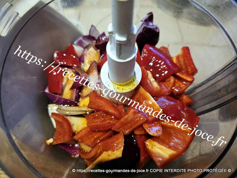 Dans le bol du robot, mettre les poivrons, l’oignon coupé grossièrement et les gousses d’ail, ajouter le piment d’Espelette, le sel et le poivre, ajouter de l’huile d’olive à ¹/³ de la hauteur des ingrédients, mixer finement le tout.