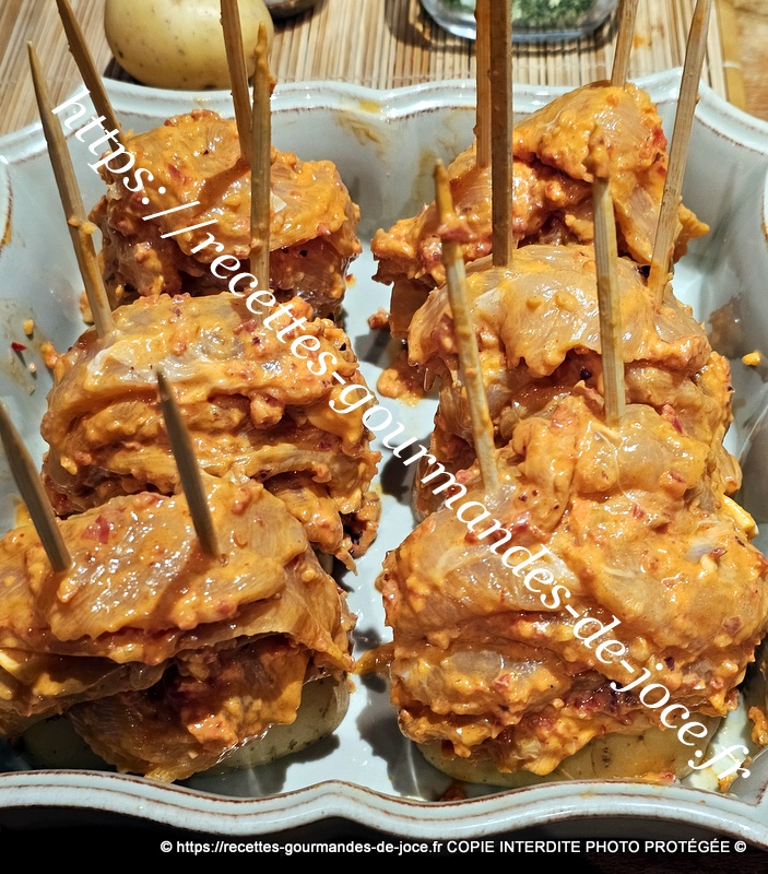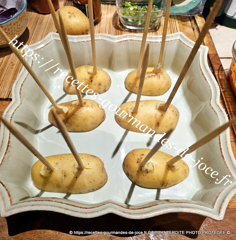 Ajouter le paprika fumé et bien mélanger le tout. Couper les pommes de terre en deux dans le sens de la longueur et les transpercer de 2 piques à brochettes en commençant pas le côté coupé. Les disposer dans un plat allant au four.
