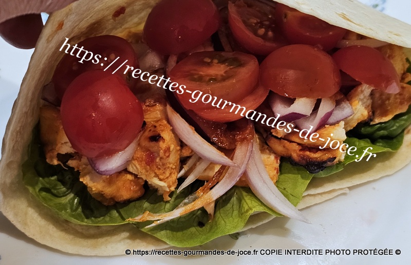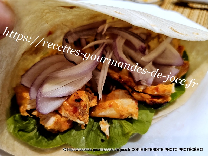 Enfiler dessus les lanières de poulet jusqu’à la moitié de la hauteur. Enfourner à 220° environ 40 minutes selon les fours et la quantité de poulet sur chaque brochette. Une fois, cuit, plier vos tortillas en forme de cornet, ajouter des feuilles de salade.