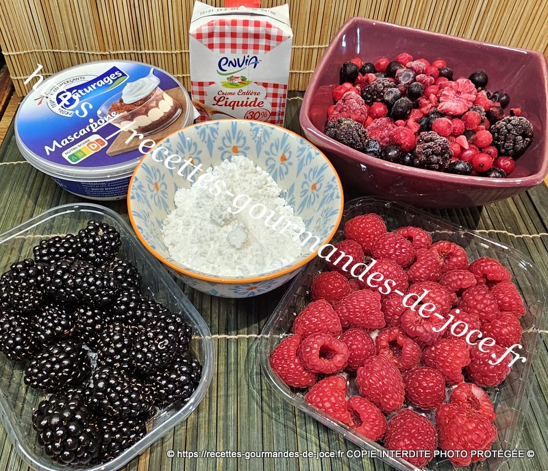Mettre les fruits rouges dans le bol du mixeur (les laisser décongeler un peu mais pas totalement) avec 3 c à s de sucre glace, mixer pour obtenir un coulis. Séparer le coulis en deux de cette façon 1/3 dans un bol et les 2/3 restant dans le 2e bol. Dans un saladier mettre la crème et le mascarpone bien froids.
