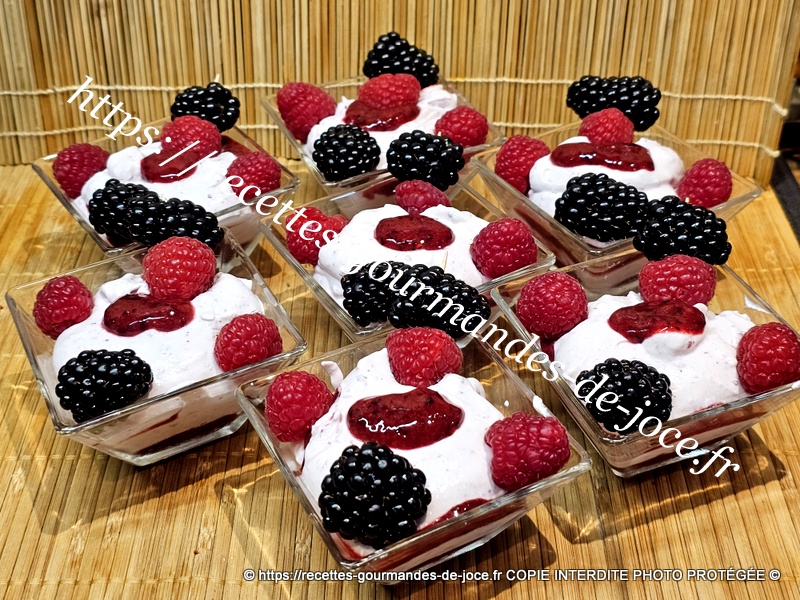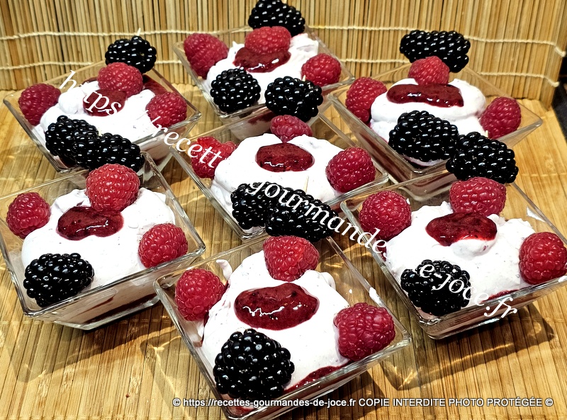 Répartir dans les verrines les ¾ du coulis restant. Répartir la crème de fruits rouges, ajouter ensuite le coulis restant et décorer avec les fruits frais selon vos goûts, réserver au frais jusqu’au moment d servir.