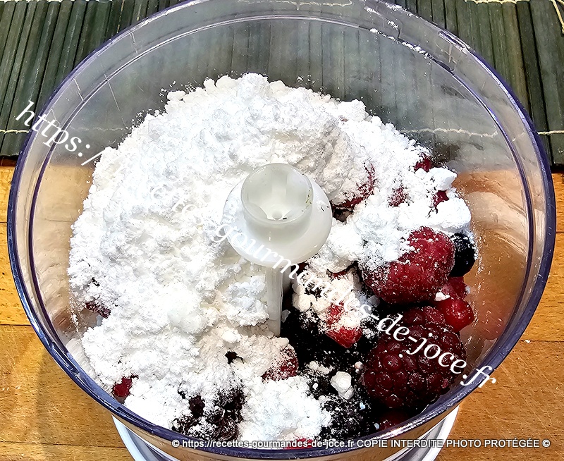 Mettre les fruits rouges dans le bol du mixeur (les laisser décongeler un peu mais pas totalement) avec 3 c à s de sucre glace, mixer pour obtenir un coulis. Séparer le coulis en deux de cette façon 1/3 dans un bol et les 2/3 restant dans le 2e bol. Dans un saladier mettre la crème et le mascarpone bien froids.
