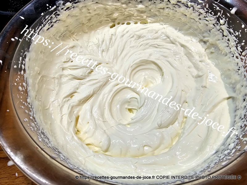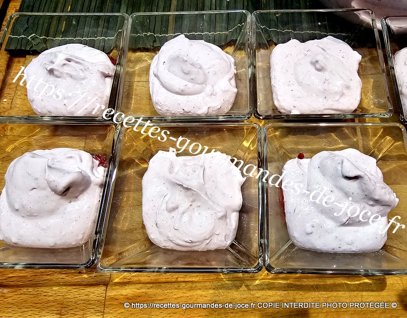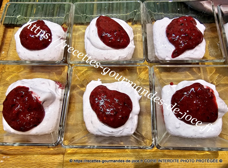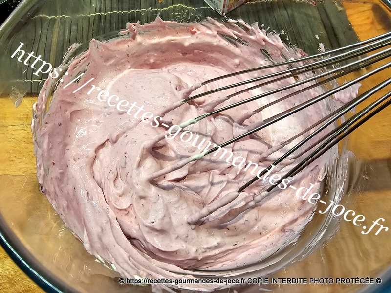 Fouetter jusqu’à obtention d’une mousse bien homogène (attention de ne pas trop fouetter longtemps car elle risque de trancher). Ajouter ensuite les 1/3 de coulis de fruits rouges, bien mélanger.