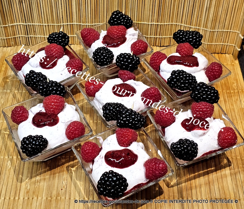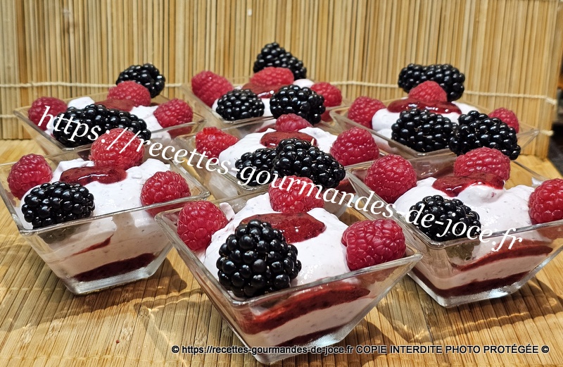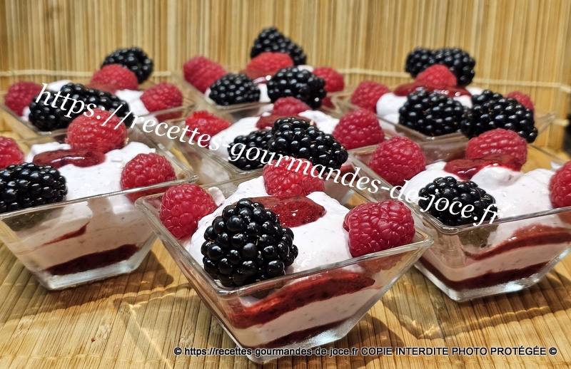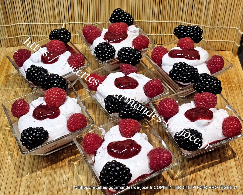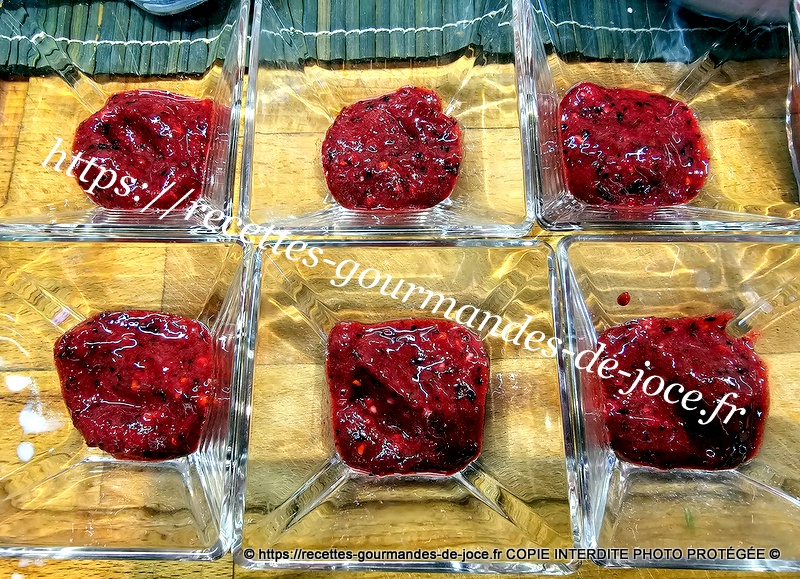 Répartir dans les verrines les ¾ du coulis restant. Répartir la crème de fruits rouges, ajouter ensuite le coulis restant et décorer avec les fruits frais selon vos goûts, réserver au frais jusqu’au moment d servir.