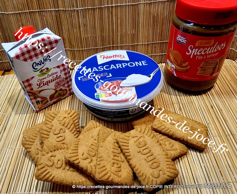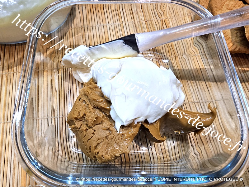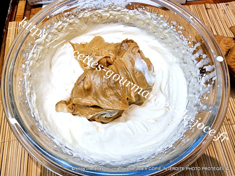 Dans un saladier mettre la crème et le mascarpone bien froids, fouetter jusqu’à obtention d’une mousse bien homogène (attention de ne pas trop fouetter longtemps car elle risque de trancher). Prélever ensuite 3 c à s que vous mettez dans un autre bol avec la pâte de spéculos.