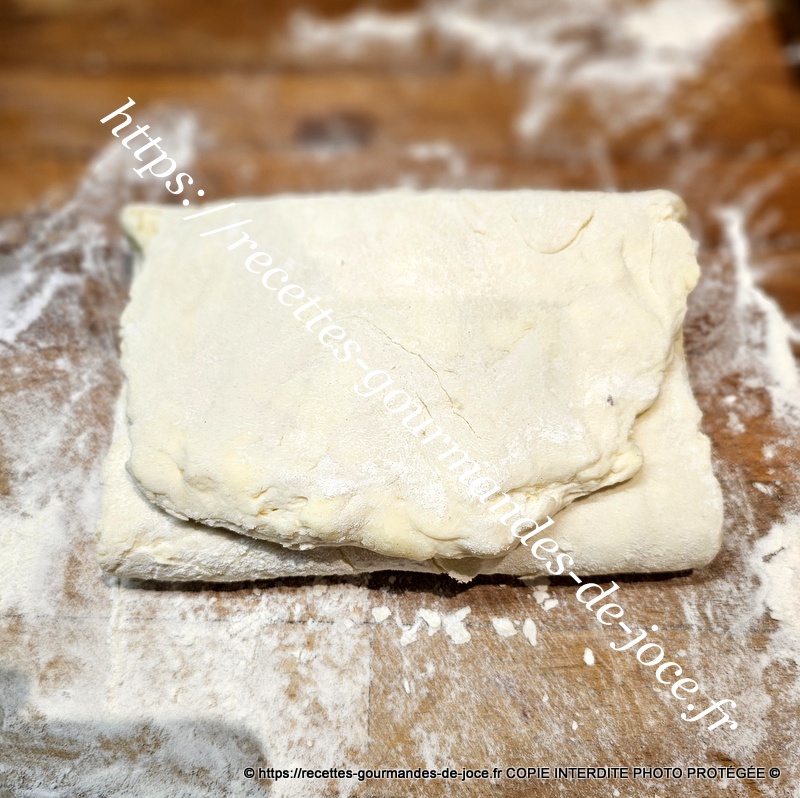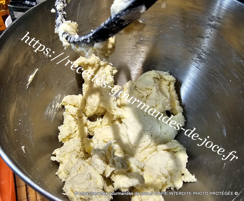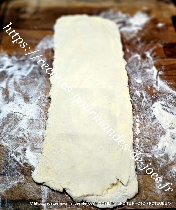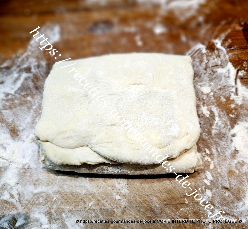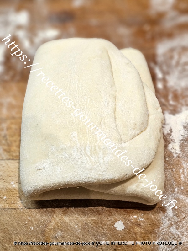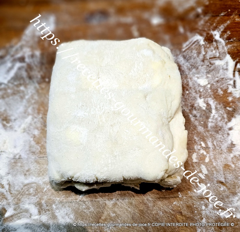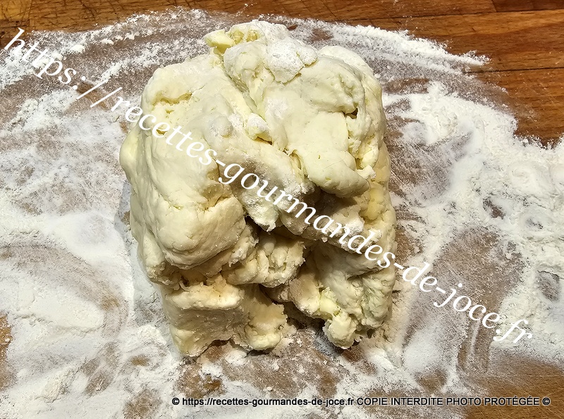 Ne travailler pas trop la pâte il faut qu’il y reste des morceaux de beurre donc 1 minute suffise. Débarrasser la pâte ensuite sur le plan de travail fariné.