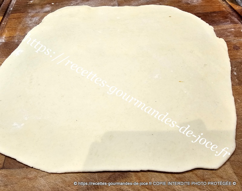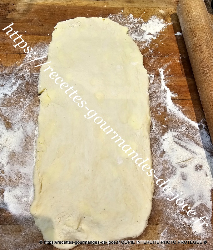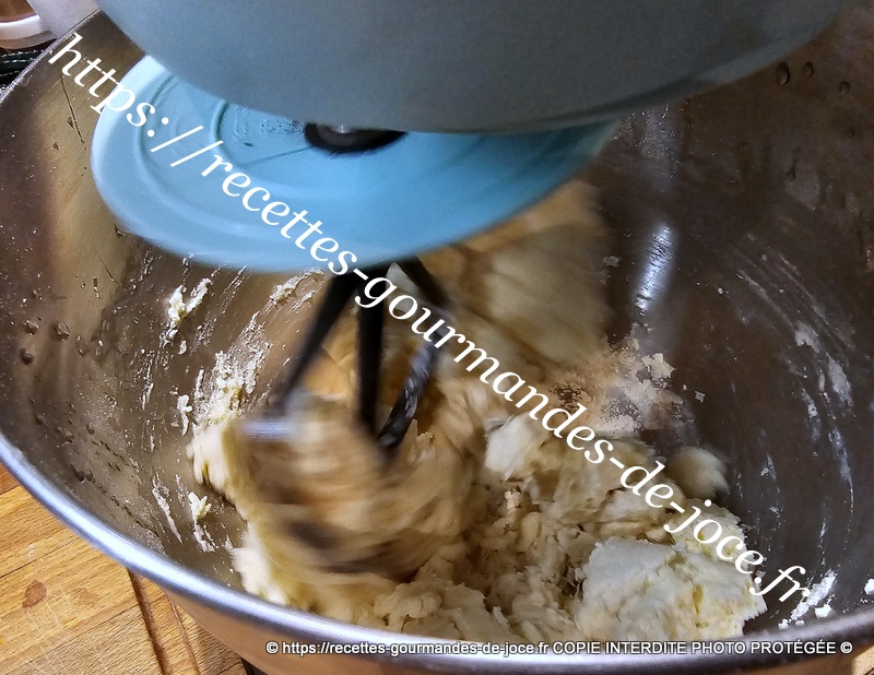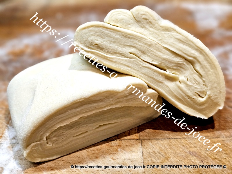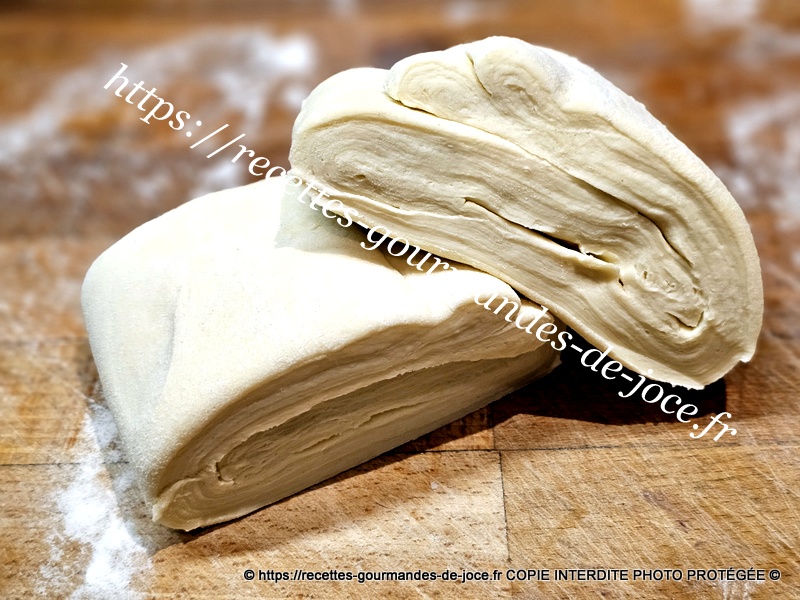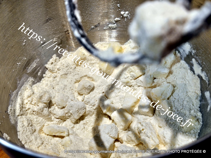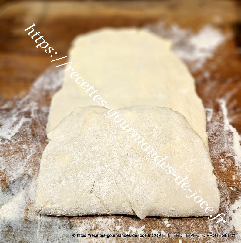 Ne travailler pas trop la pâte il faut qu’il y reste des morceaux de beurre donc 1 minute suffise. Débarrasser la pâte ensuite sur le plan de travail fariné.