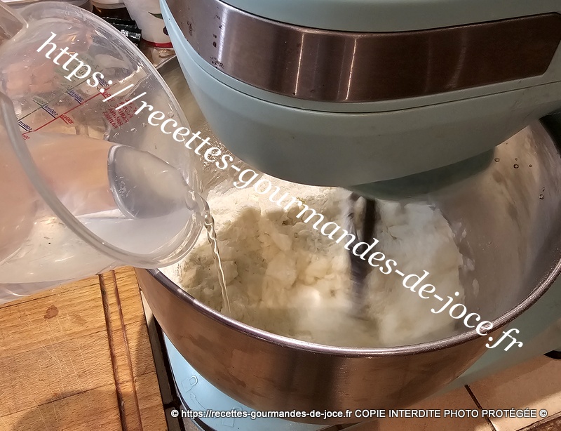 Mélanger le sel et la farine, verser le tout dans le bol du robot et ajouter le beurre et pétrir à petite vitesse en ajoutant l’eau progressivement.