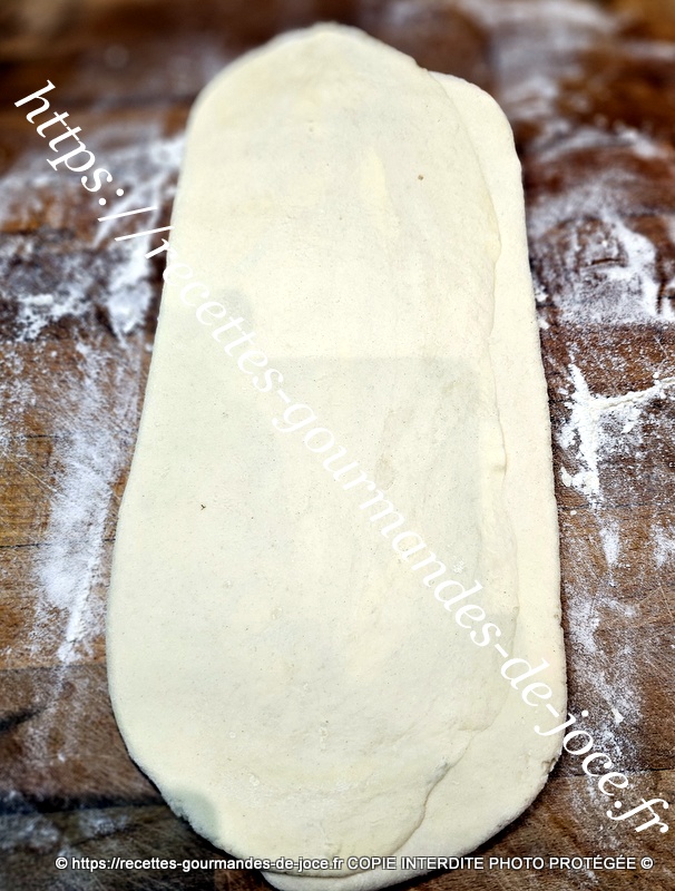Étaler la pâte en forme de rectangle d’environ 45 cm de haut sur 20 de large. Plier la base de moitié vers le haut et rabattre dessus le haut de la pâte (voir les photos).