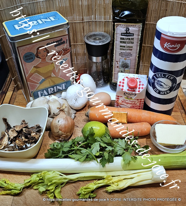 Laver et émincer finement le poireau et le céleri, peler et hacher l’oignon, peler, laver et couper les carottes en fines rondelles, laver et ciseler le persil. Nettoyer les champignons, couper les champignons de Paris en 4, les lamelles de pleurotes en deux si elles sont grosses, mettre à réhydrater les cèpes dans de l’eau chaude, puis les égoutter.