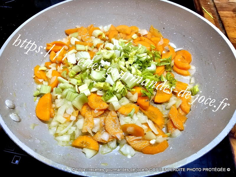 Ajouter les oignons et les carottes, laisser suer 5 minutes en remuant, ajouter ensuite le céleri et mélanger.