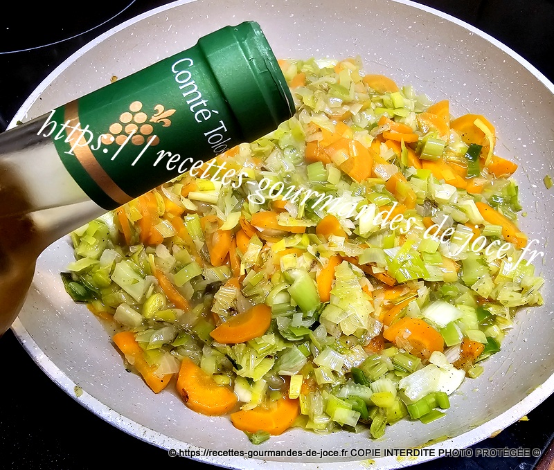 Ajouter les poireaux, mélanger à nouveau et verser le vin blanc.