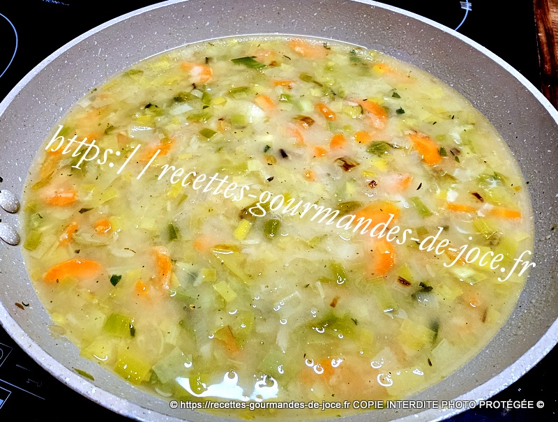 Mélanger, puis verser le bouillon, remuer et laisser mijoter le temps que la sauce épaississe.