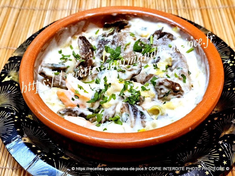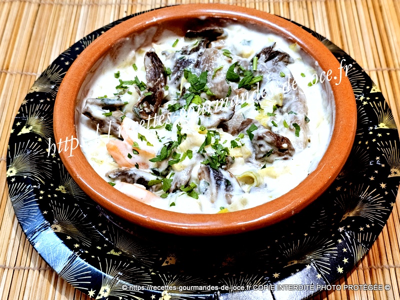 Lorsqu’elle est épaisse, arrêter la cuisson et ajouter la crème, mélanger. Ajouter ensuite les champignons, mélanger (photo oubliée 🙁 ), répartir dans des ramequins, parsemer d’un peu de persil et servir sans attendre.