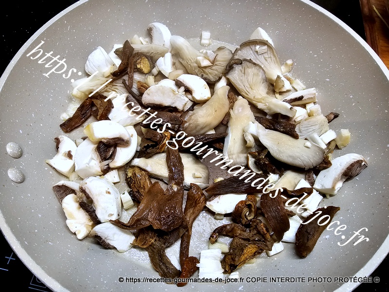 Laver et émincer finement le poireau et le céleri, peler et hacher l’oignon, peler, laver et couper les carottes en fines rondelles, laver et ciseler le persil. Nettoyer les champignons, couper les champignons de Paris en 4, les lamelles de pleurotes en deux si elles sont grosses, mettre à réhydrater les cèpes dans de l’eau chaude, puis les égoutter.