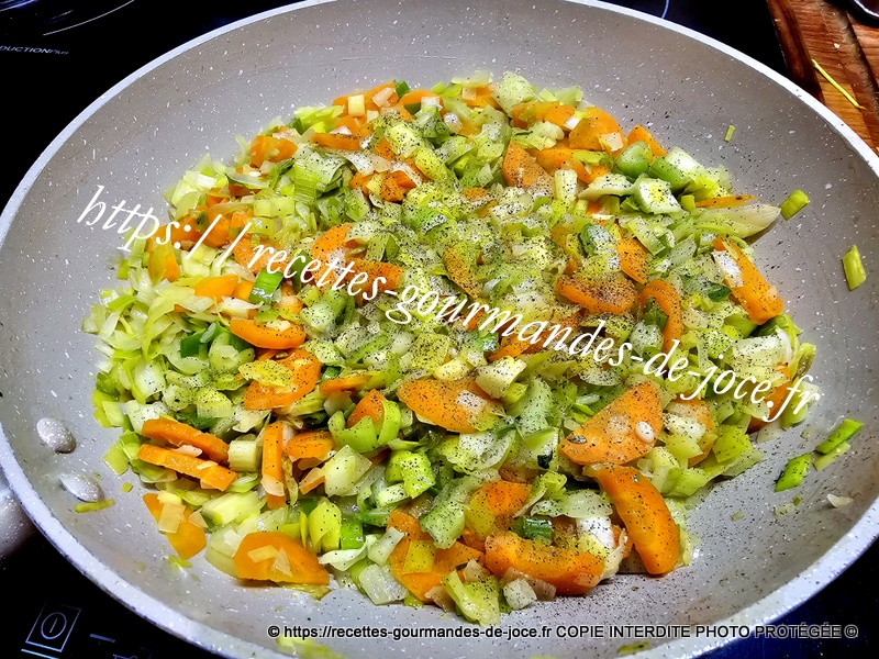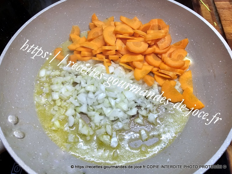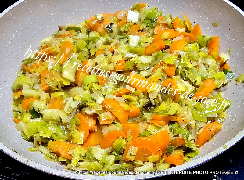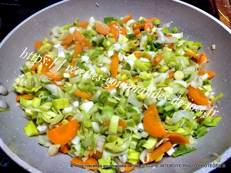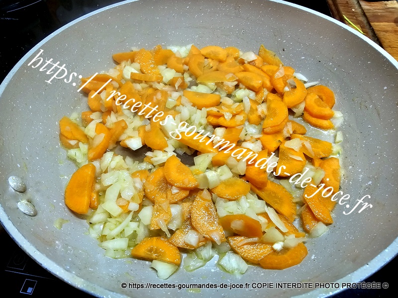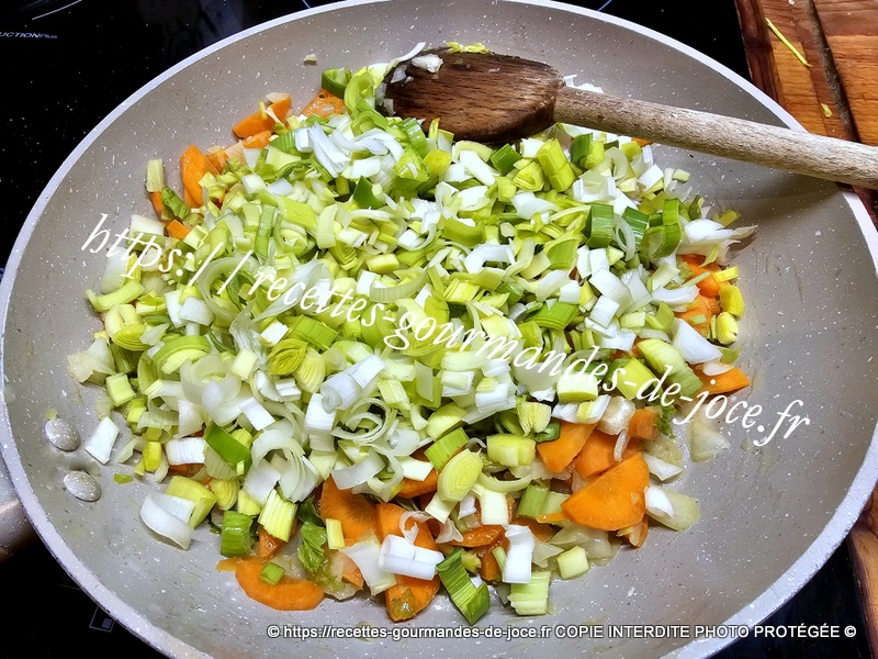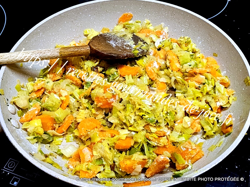 Ajouter les oignons et les carottes, laisser suer 5 minutes en remuant, ajouter ensuite le céleri et mélanger.