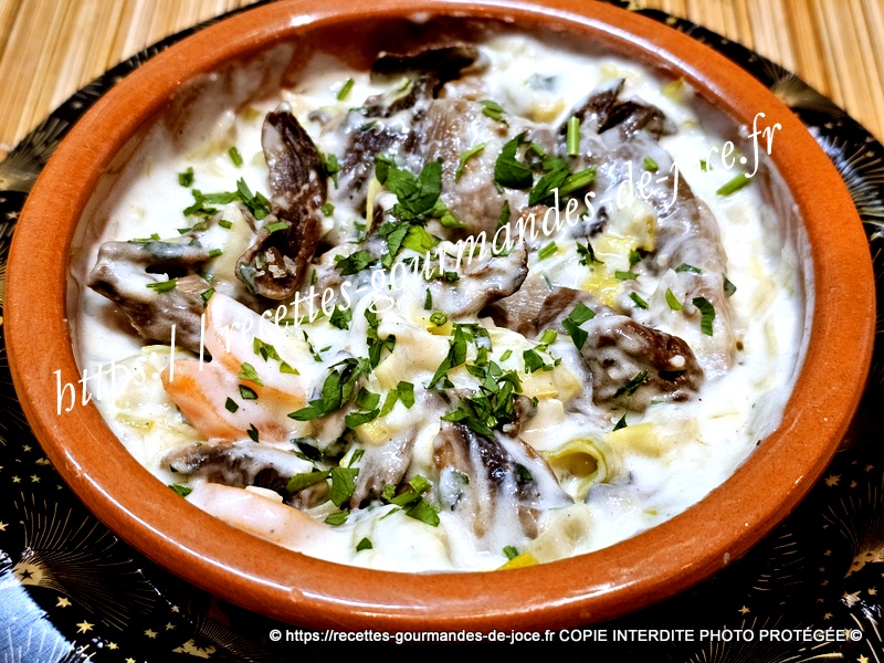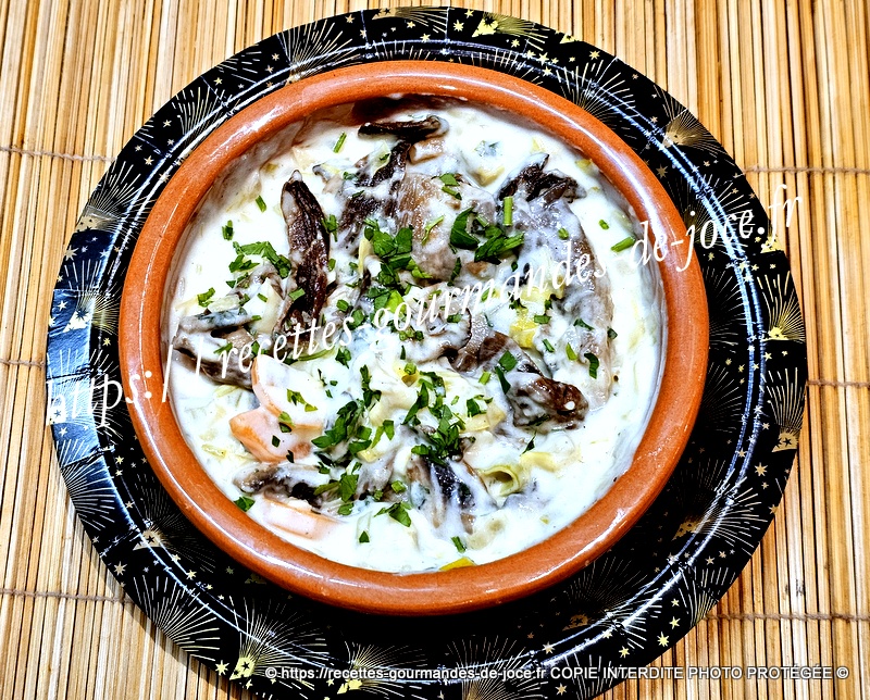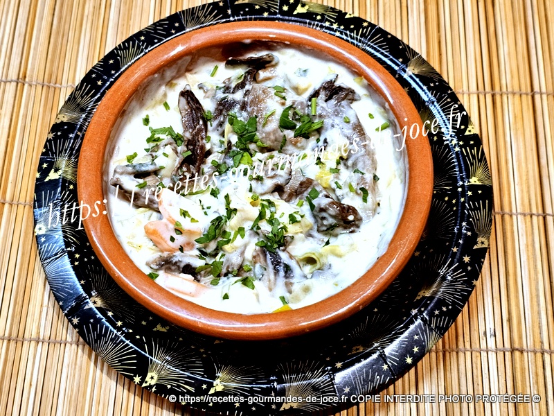 Lorsqu’elle est épaisse, arrêter la cuisson et ajouter la crème, mélanger. Ajouter ensuite les champignons, mélanger (photo oubliée 🙁 ), répartir dans des ramequins, parsemer d’un peu de persil et servir sans attendre.