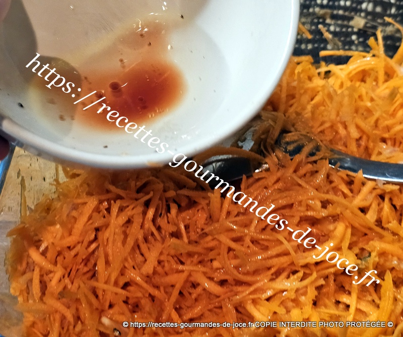 Réaliser la vinaigrette et la verser dans les carottes, bien mélanger puis ajouter les poivrons refroidis, mélanger à nouveau. Rectifier au besoin l’assaisonnement et servir en entrée ou en accompagnement d’un barbecue.