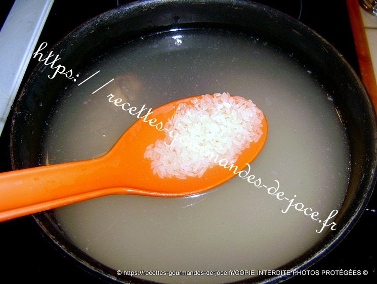 Mettre le riz à cuire dans une marmite d’eau salée à ébullition, lorsqu’il est cuite l’égoutter et le refroidir en le passant sous l’eau froide, réserver.