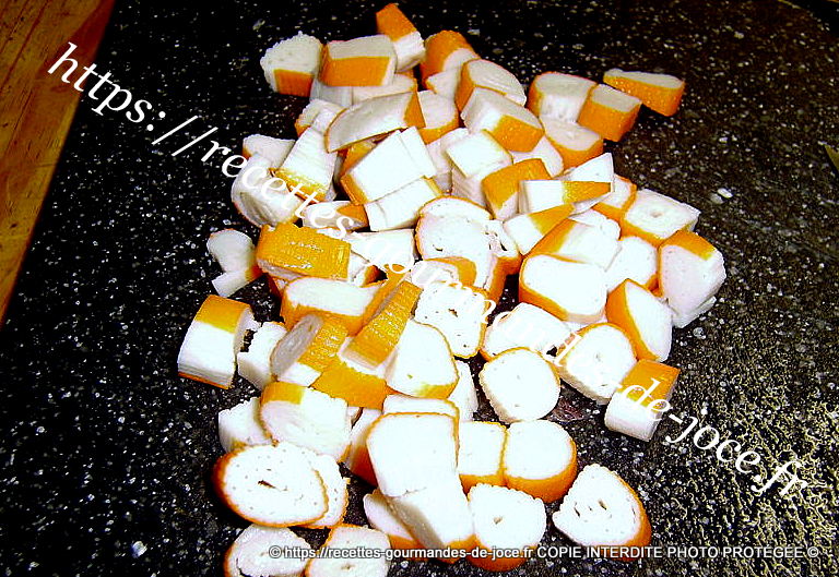 Coupez le surimi en petits morceaux, laver et couper la moitié du bulbe de fenouil en petits morceaux, laver et ciselez les tiges d’oignon et hacher l’oignon.