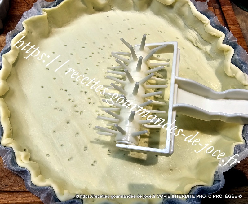 Lorsqu’ils sont cuits les égoutter et les presser avec une écumoire pour en faire sortir toute l’eau. Préchauffer le four à 200°. Déposer la pâte feuilletée dans un moule à tarte.