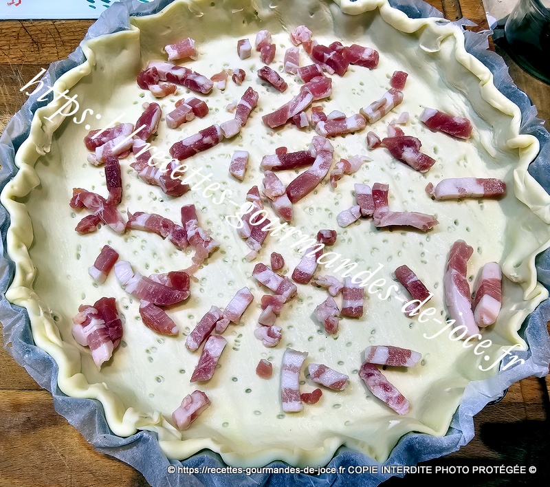 Piquer le fond, répartir dessus les lardons et le fromage de chèvre en morceaux.