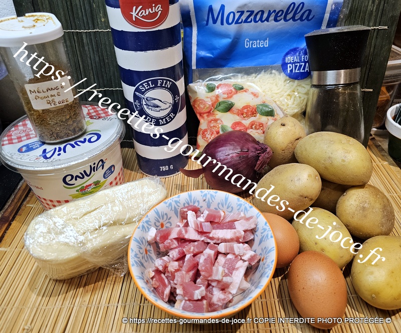 Ajouter la totalité des oignons et des lardons, répartir la moitié de la mozzarelle et ajouter le reste des pommes de terre.