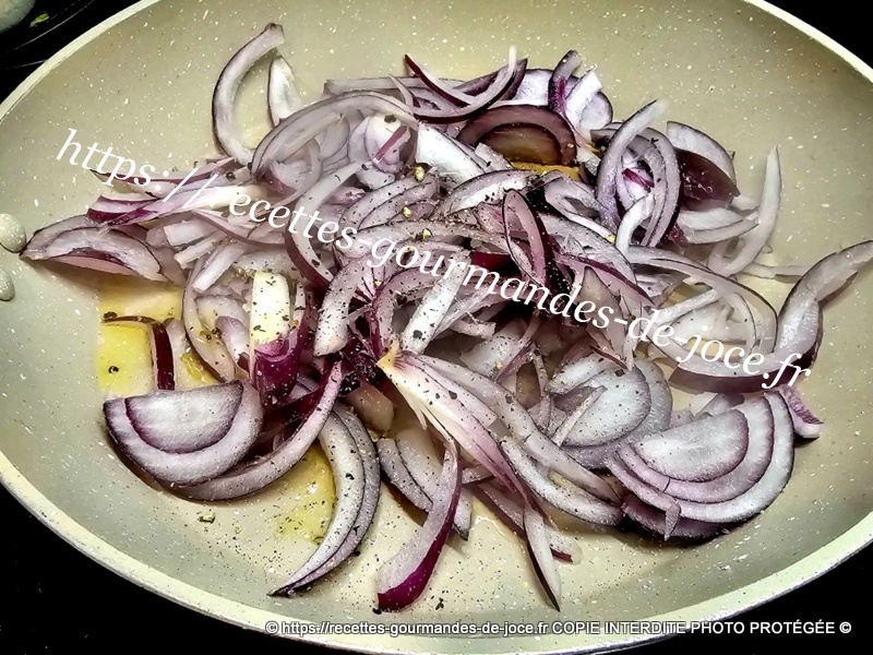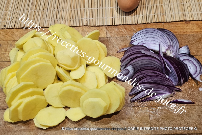 Peler, laver et couper les pommes de terre en tranches d’environ d’un demi-cm d’épaisseur. Peler et émincer finement l’oignon. Dans une poêle mettre un filet d’huile d’olive et ajouter les oignons, saler et poivrer.