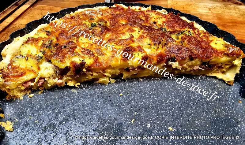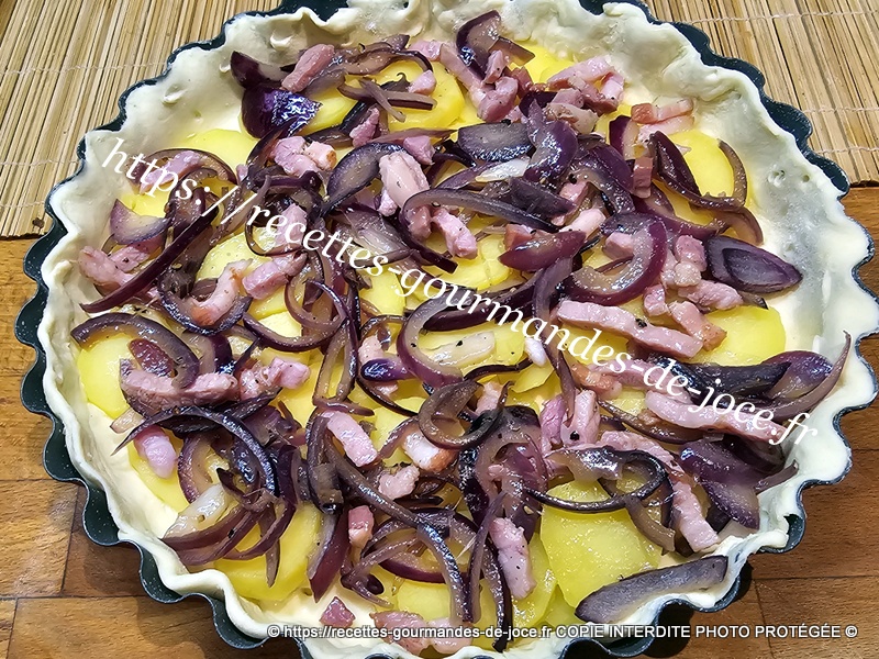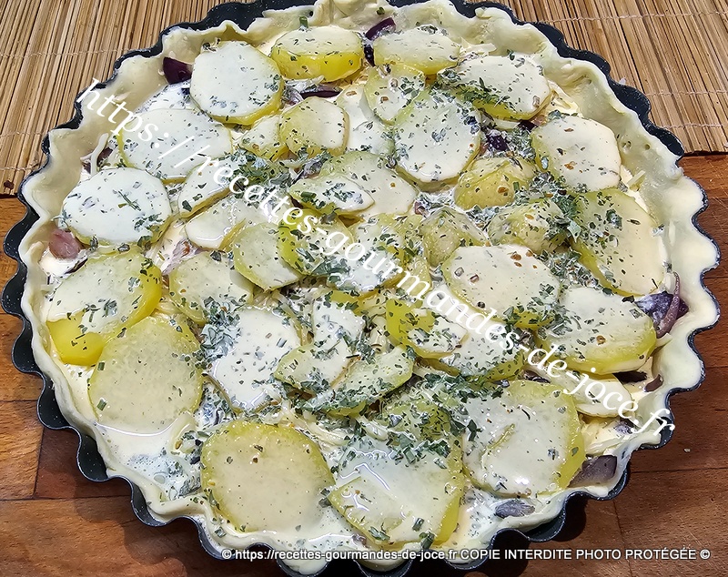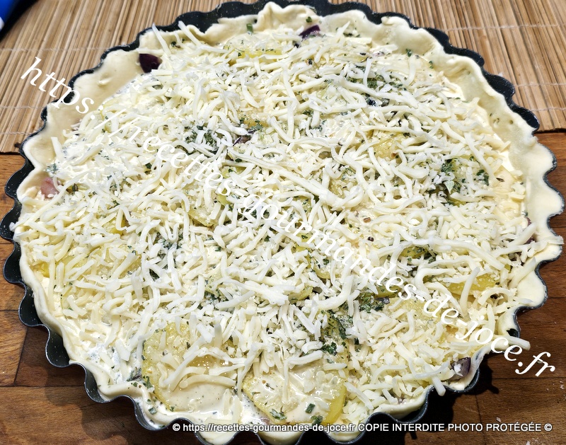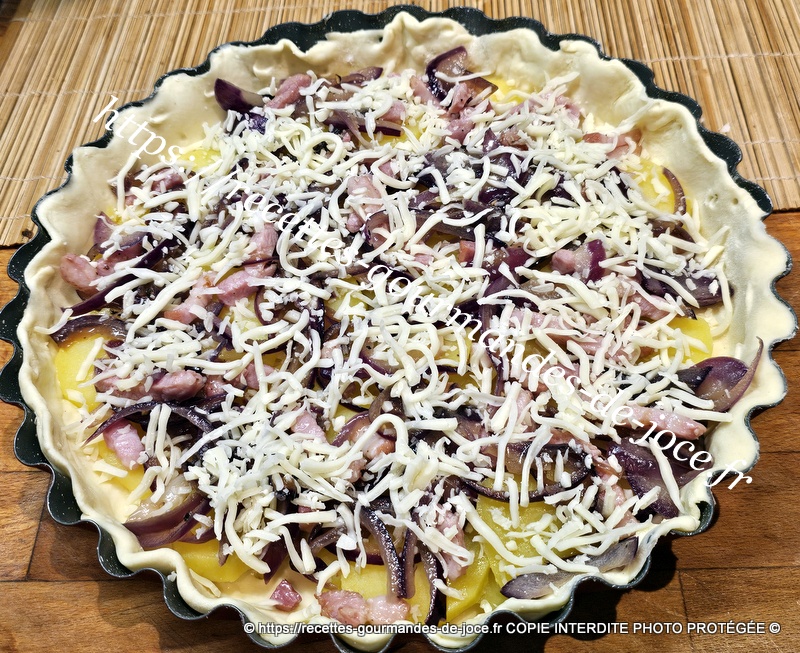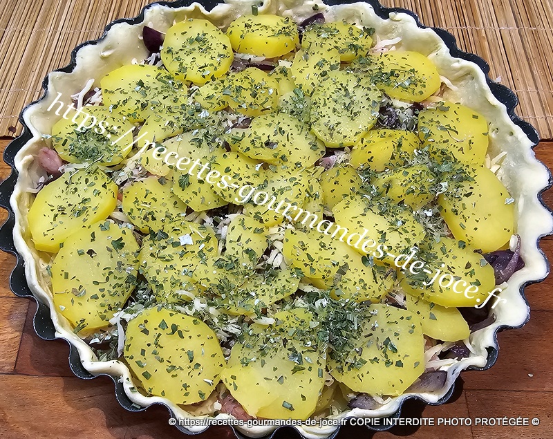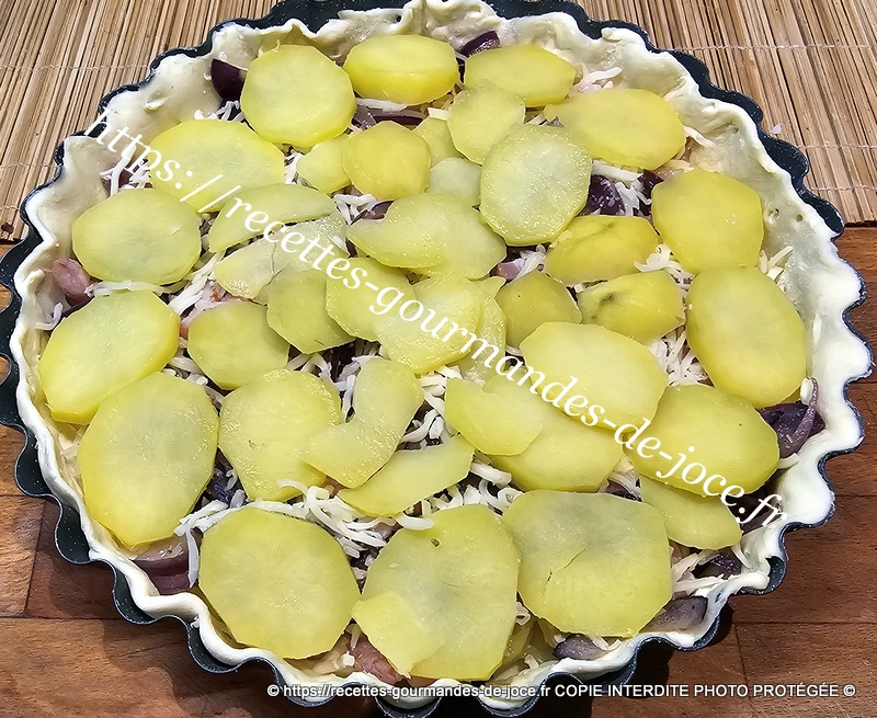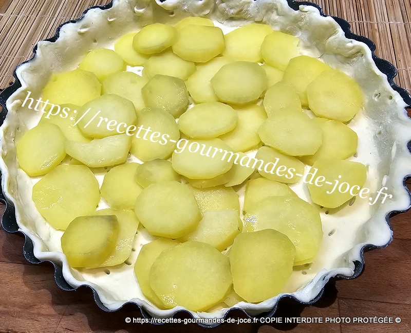 Mettre la pâte dans un moule à tarte, piquer le fond, répartir la moitié des pommes de terre.