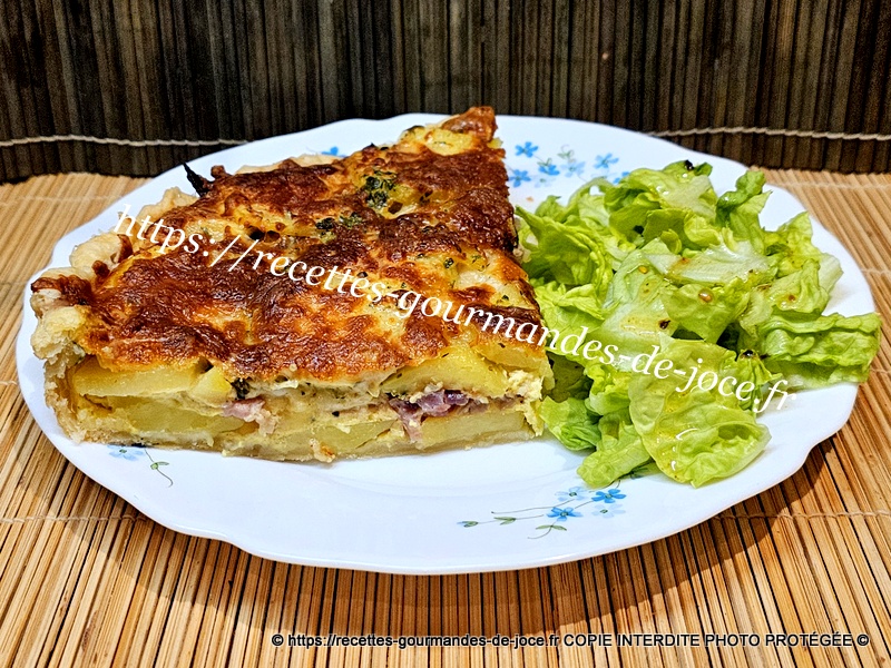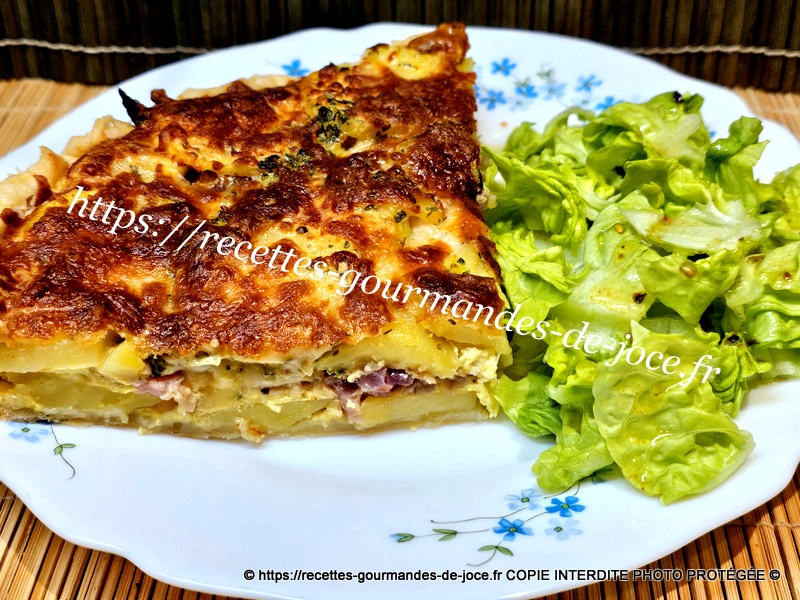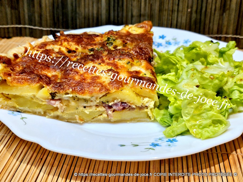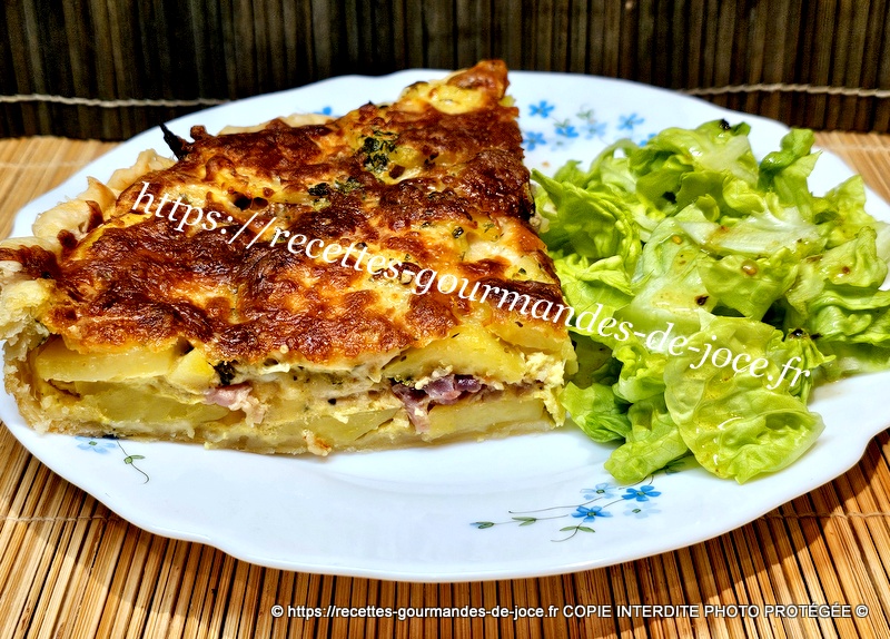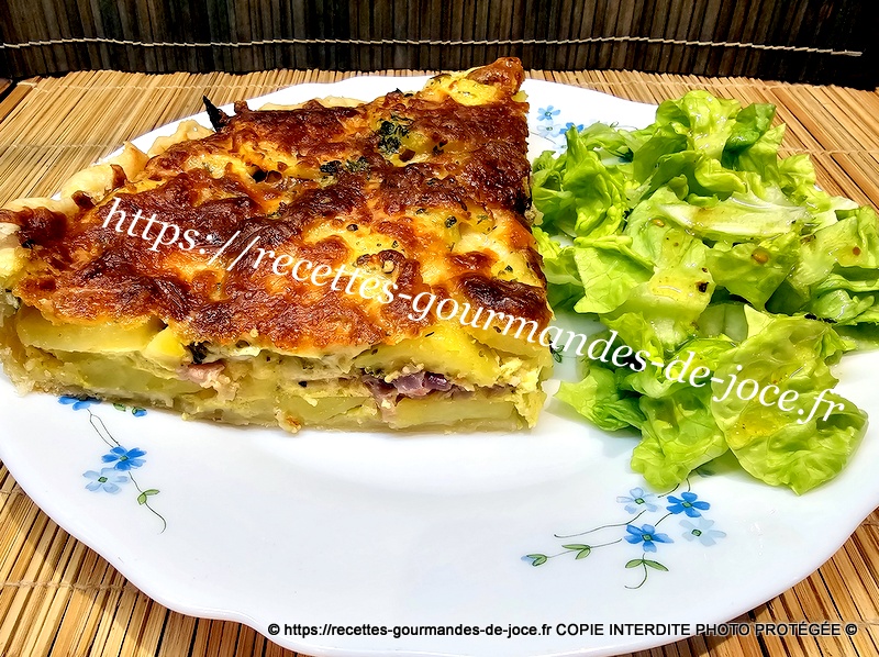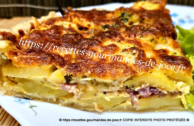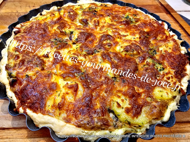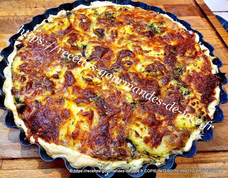 Mettre la pâte dans un moule à tarte, piquer le fond, répartir la moitié des pommes de terre.
