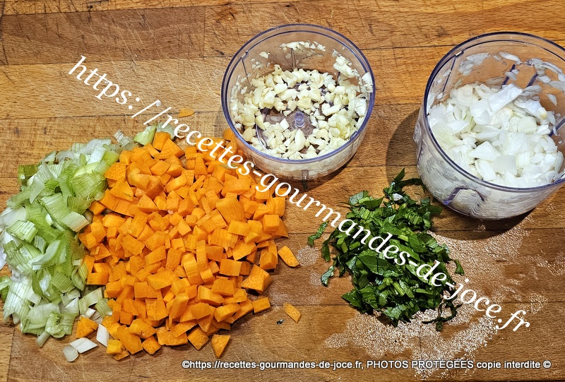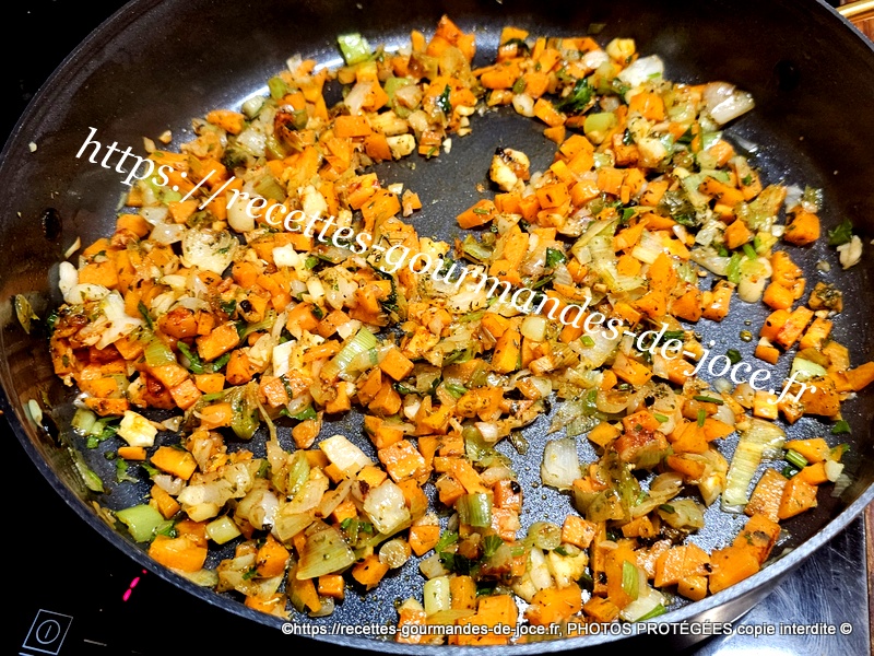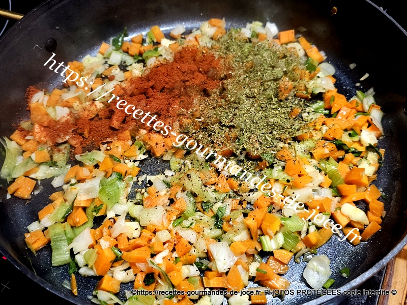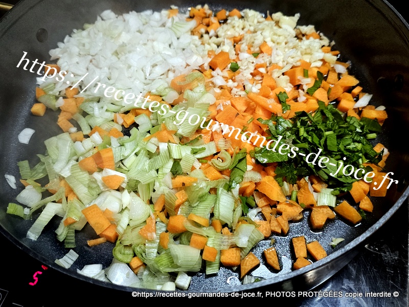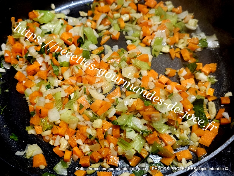 Dans une sauteuse, mettre un filet d’huile d’olive à chauffer puis ajouter les carottes, les oignons, l’ail, le céleri, faire suer le tout sans coloration.