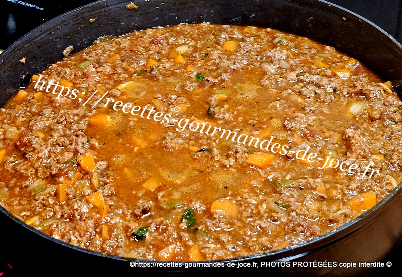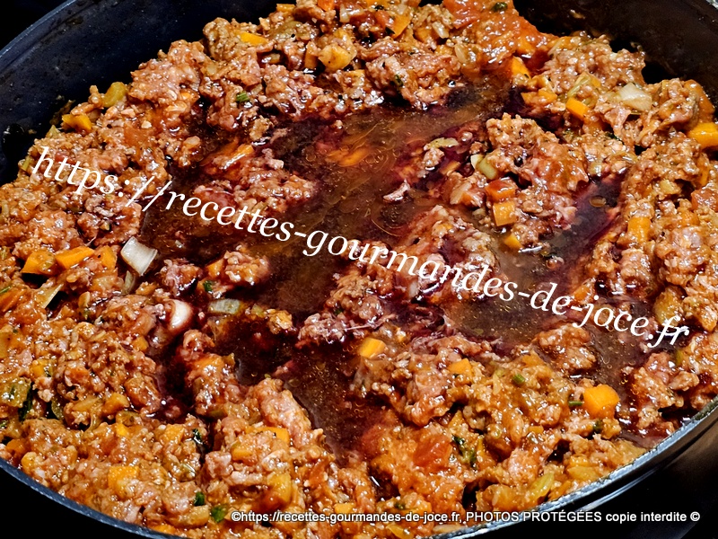 Ajouter la sauce tomate, le vin rouge et mélanger à nouveau.