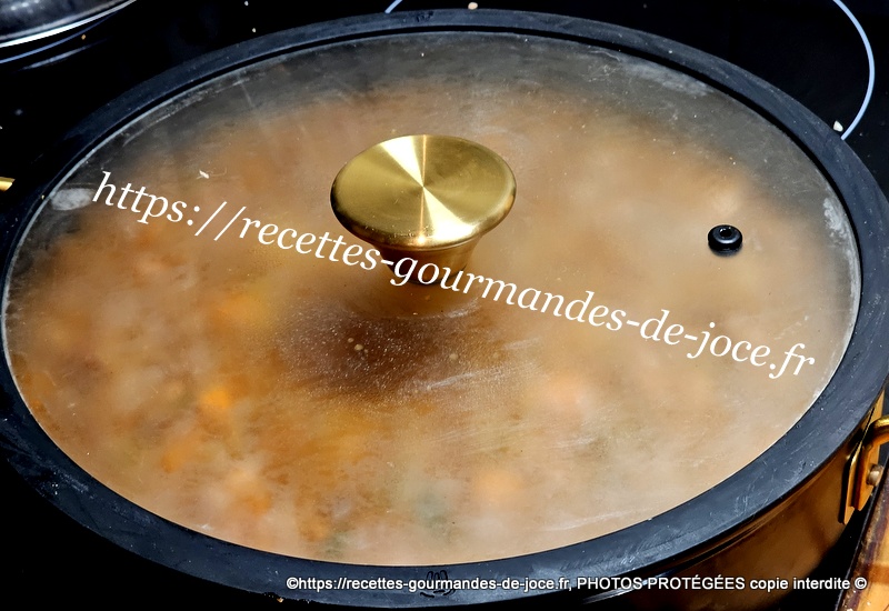 Ajouter le bouillon de volaille, remuer et couvrir laisser mijoter à feu doux environ 30 minutes, remuer de temps en temps.