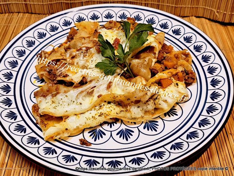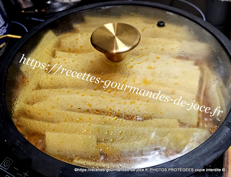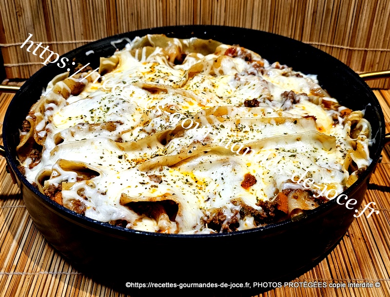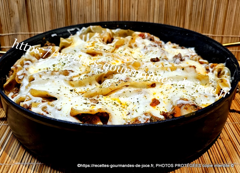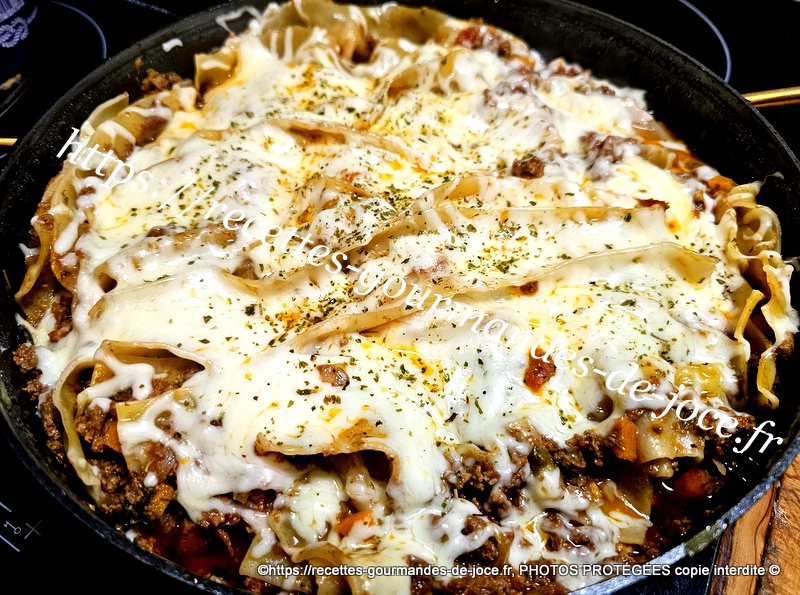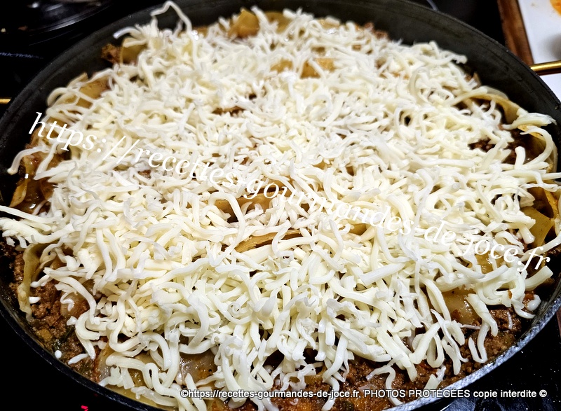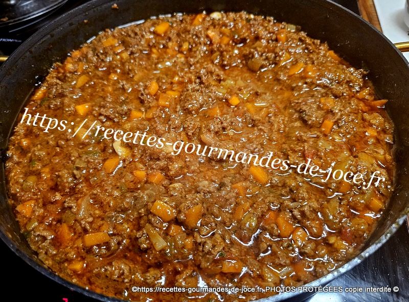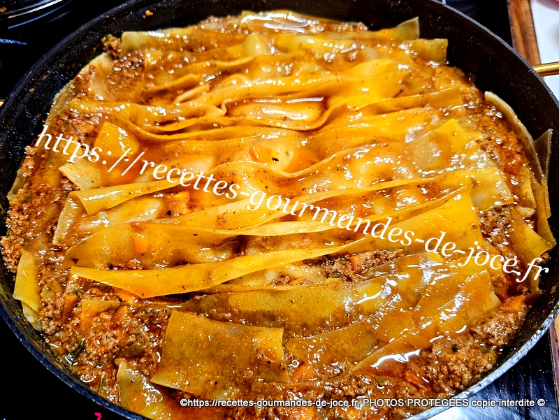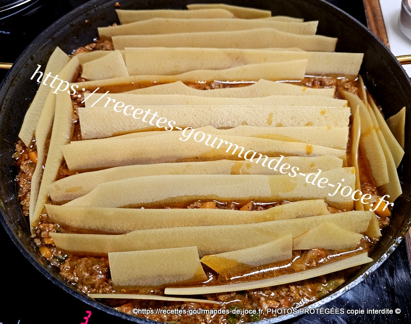 Au bout de 30 minutes, ajouter les feuilles de lasagnes comme sur la photo, remettre le couvercle et poursuivre la cuisson, enfoncer les lasagnes à mi-cuisson dans la viande pour une cuisson uniforme des feuilles de lasagnes.