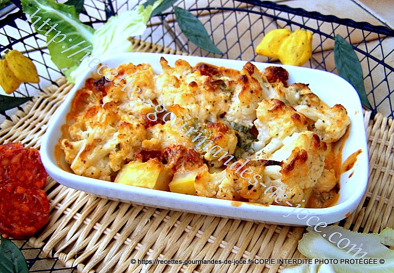 Gratin de chou-fleur et pommes de terre à la béchamel au chorizo.