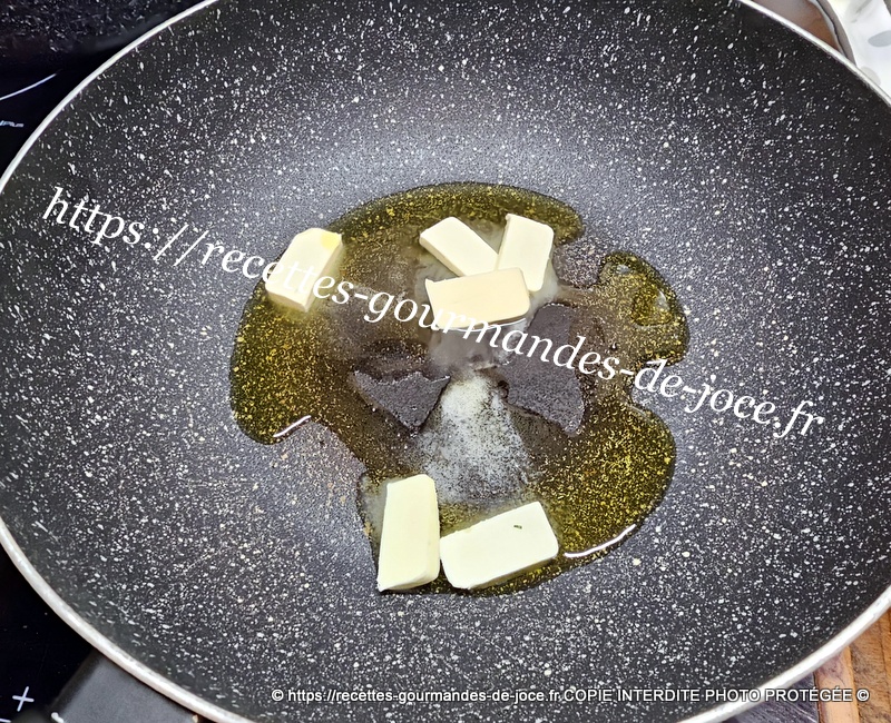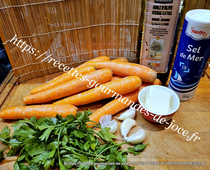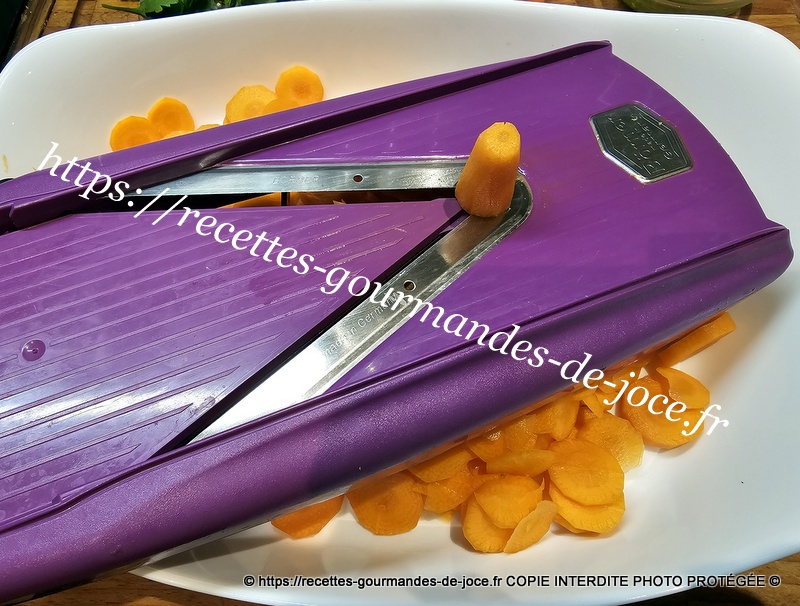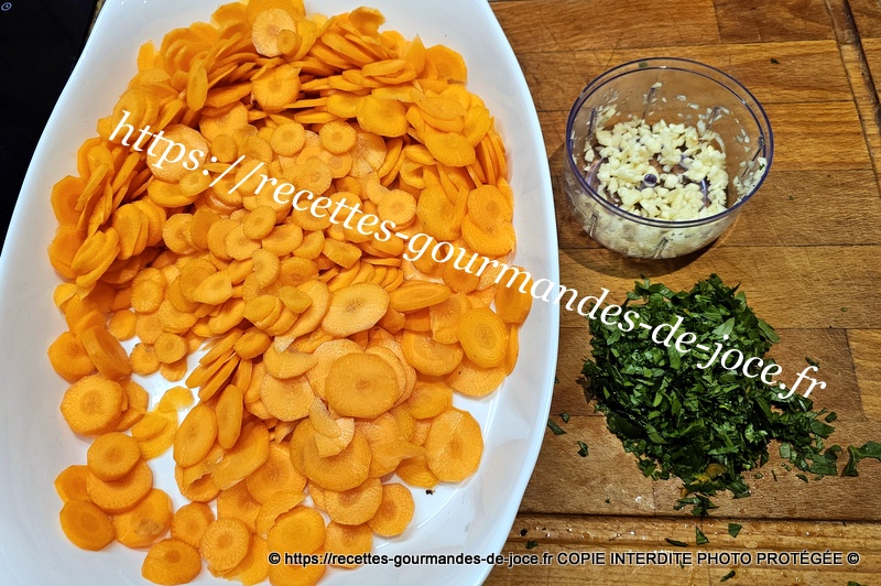 Peler, laver et couper les carottes à la mandoline, peler, dégermer et hacher les gousses d’ail, laver et ciseler le persil. Dans une poêle, mettre à chauffer l’huile d’olive et un morceau de beurre.