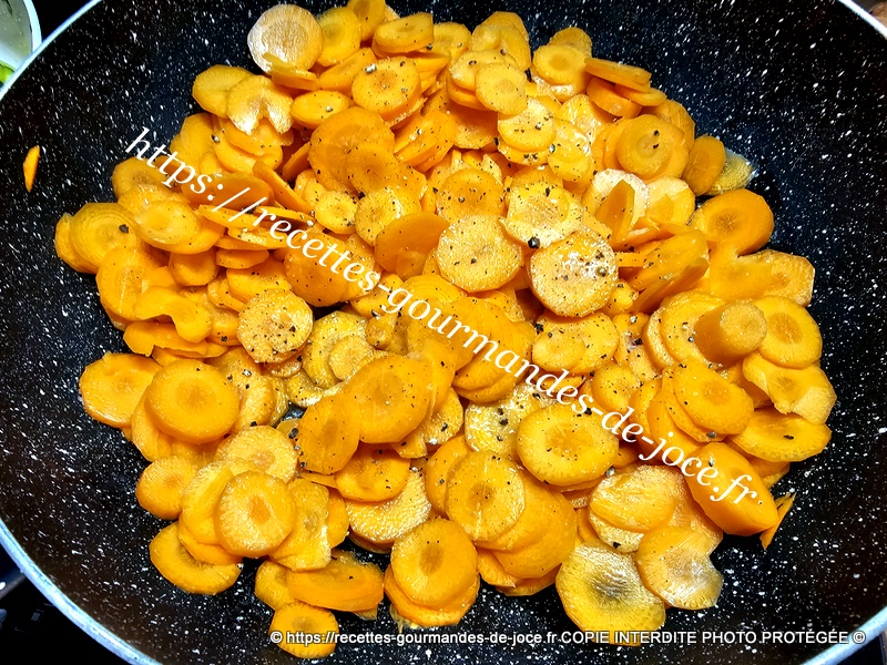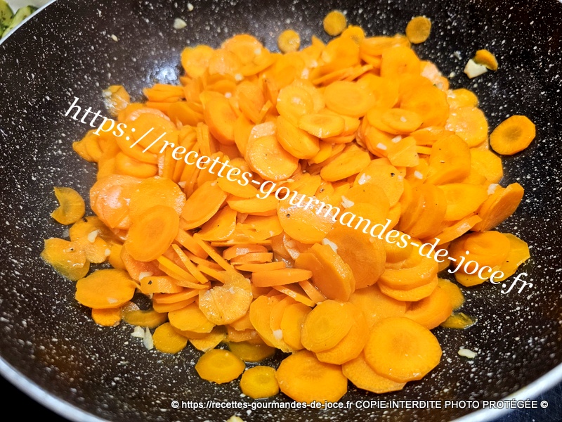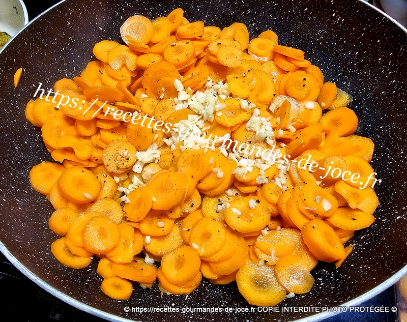 Quand le beurre est fondu, ajouter les carottes, saler légèrement et poivrer, mélanger, ajouter ensuite l’ail.