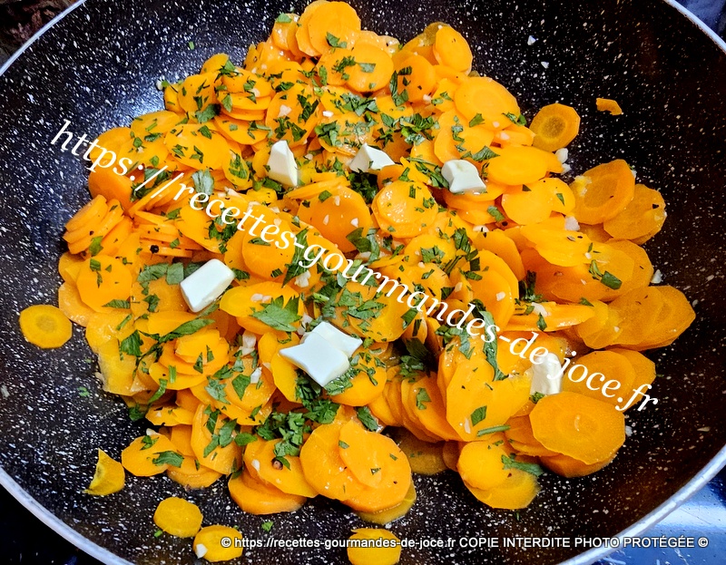 Ajouter ½ verre d’eau et mélanger, laisser mijoter à feu doux environ 15/20 minutes selon l’épaisseur des rondelles de carottes et vos goûts. Remuer régulièrement. Lorsque les carottes sont cuites selon vos goûts, ajouter le persil et le morceau de beurre restant coupé en petits morceaux, remuer et servir sans attendre 😉