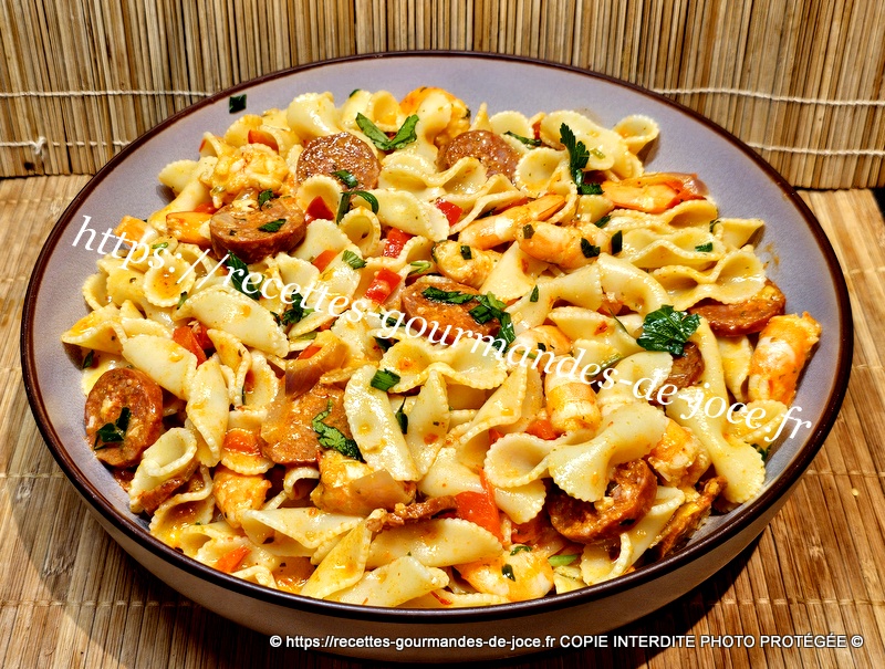 Spaghettis aux crevettes et chorizo sauce crémée.