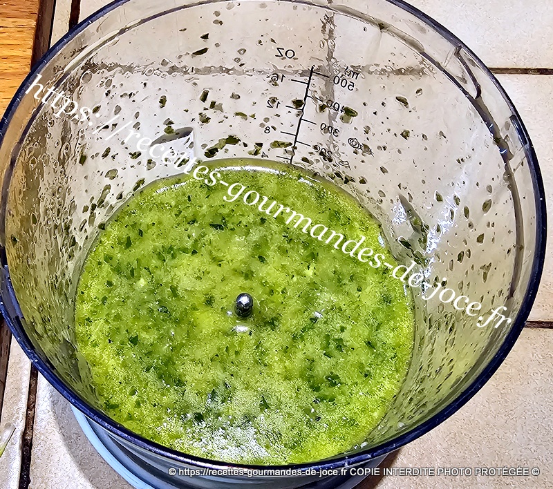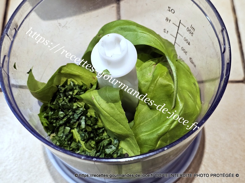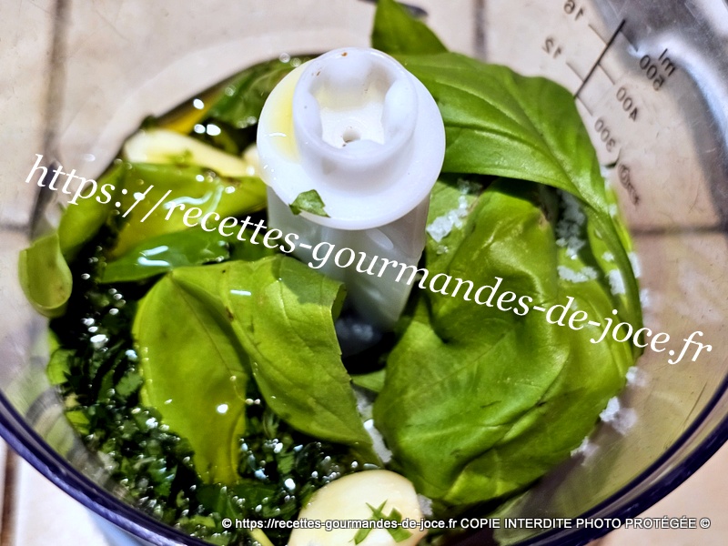 Dans le bol du mixeur, mettre les feuilles de basilic lavées et essorées, ajouter le persil, les gousses d’ail pelées et dégermées, saler et couvrir d’huile d’olive, mixer finement. Réserver.