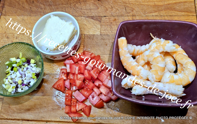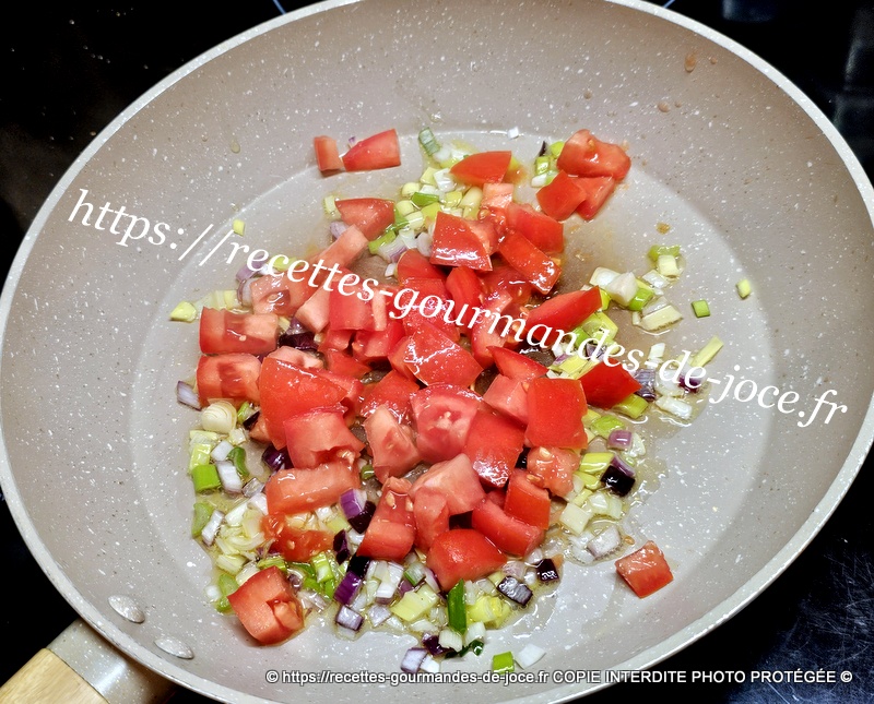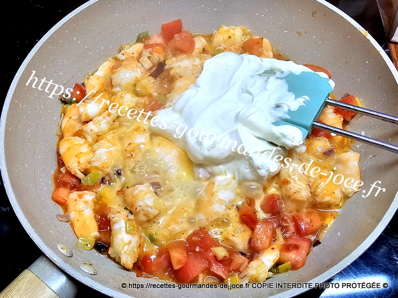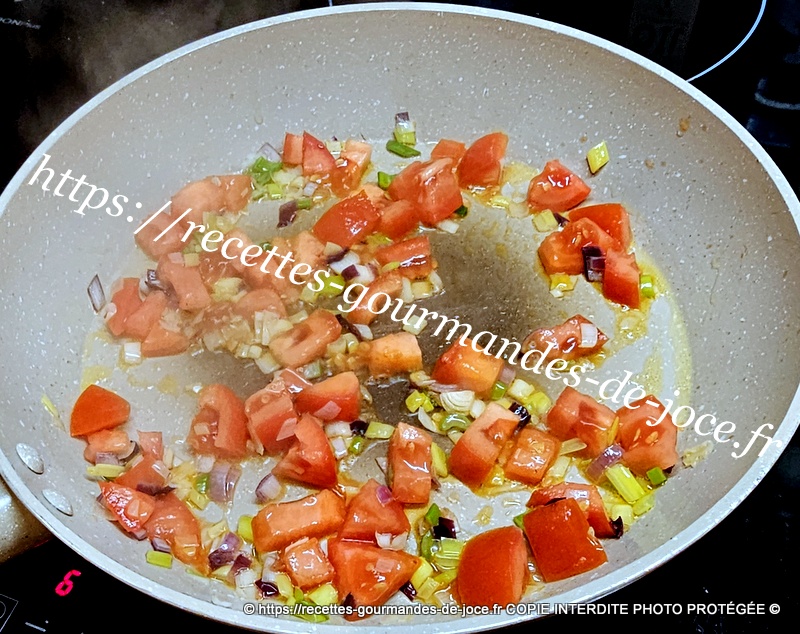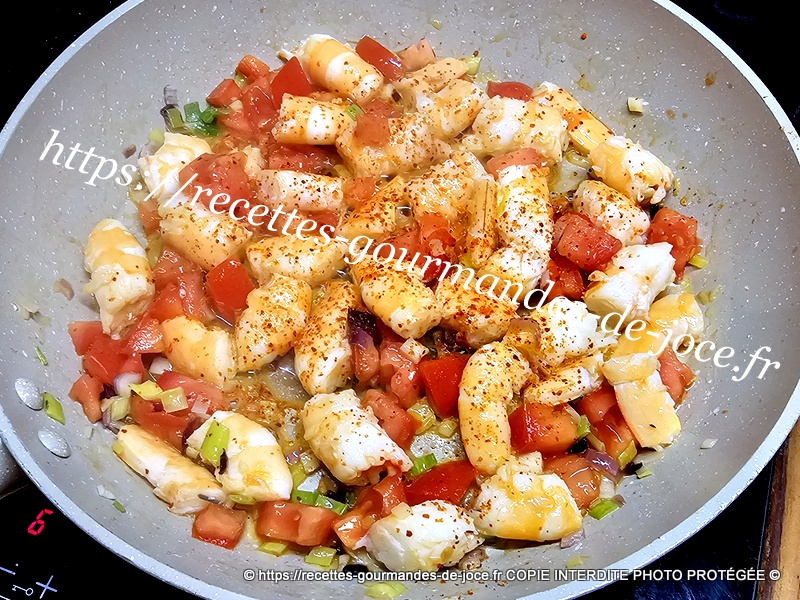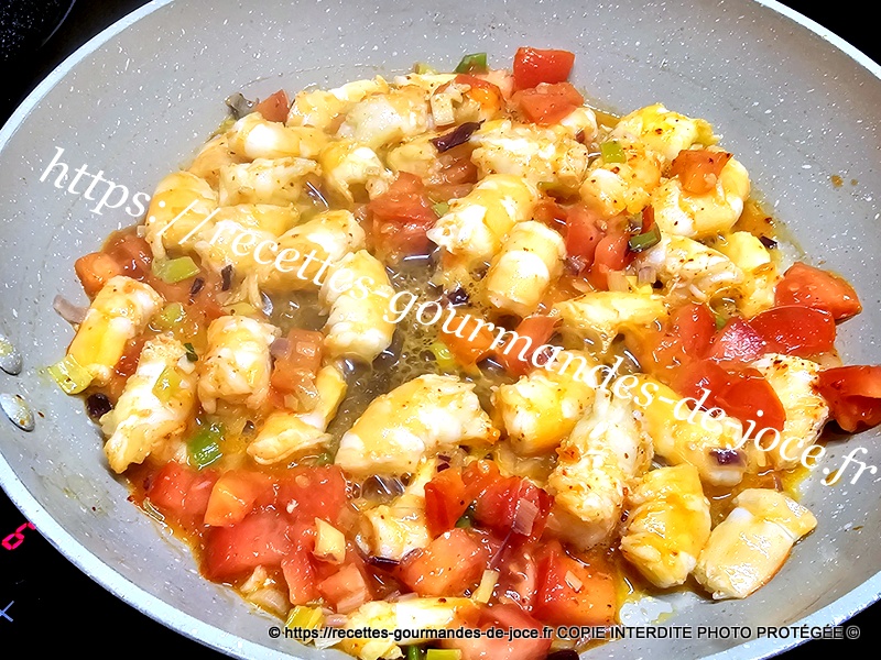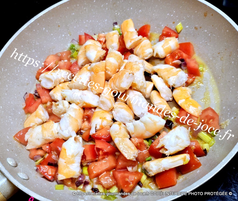 Ajouter les tomates, et les laisser mijoter une bonne minute en remuant, ajouter ensuite les crevettes.