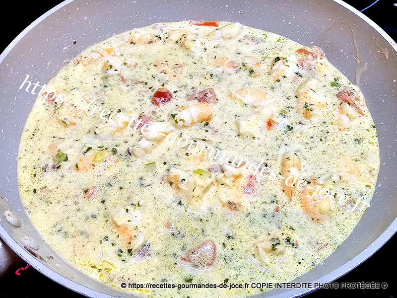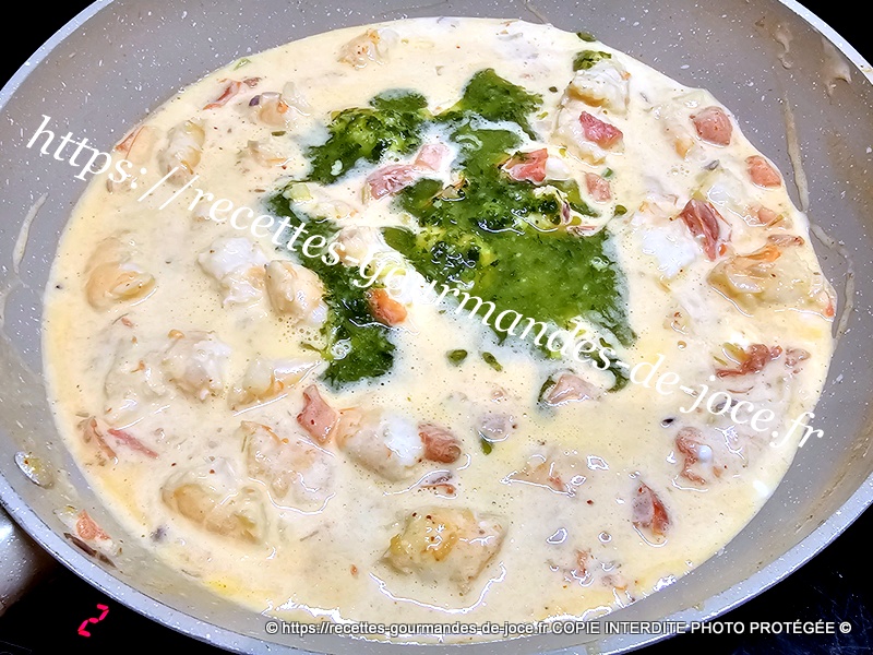Mélanger, saler et poivrer, ajouter 2 bonnes pincées de piment d’Espelette, remuer, laisser chauffer quelques instants puis ajouter la crème.