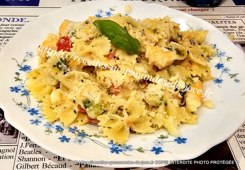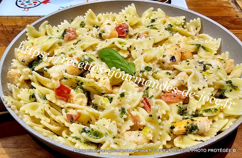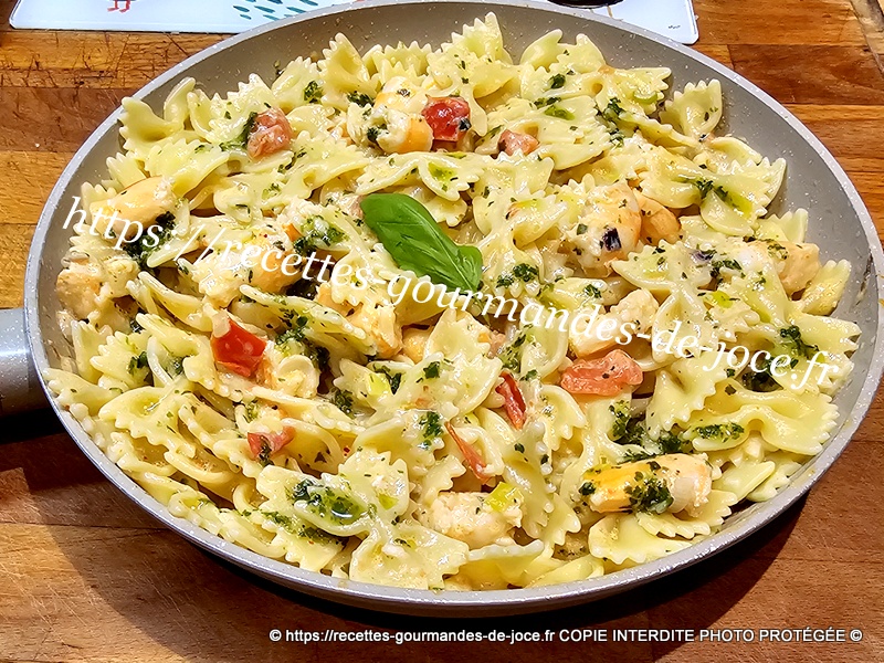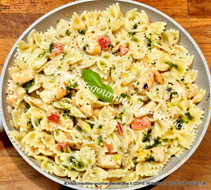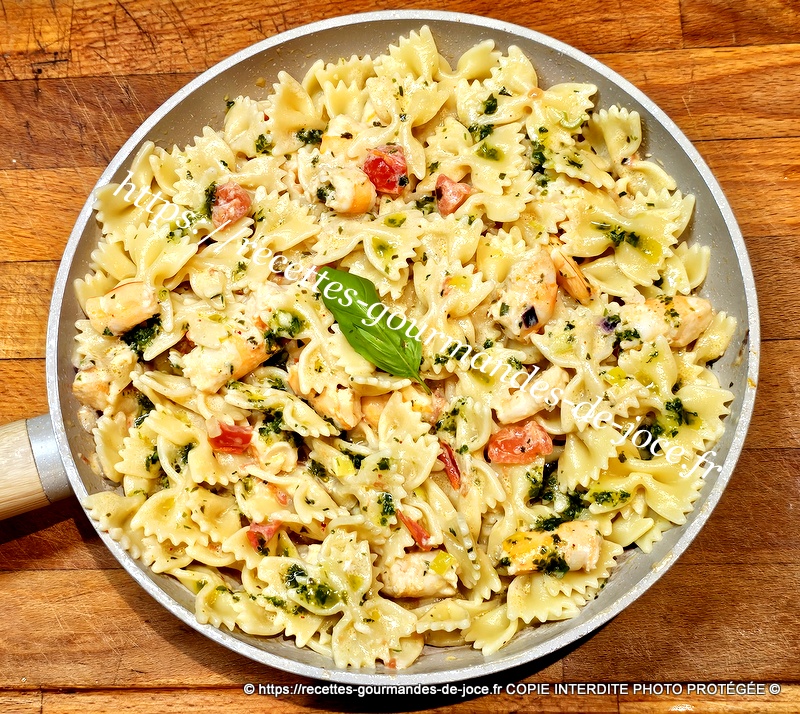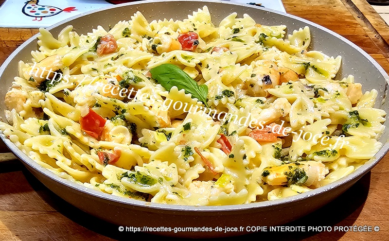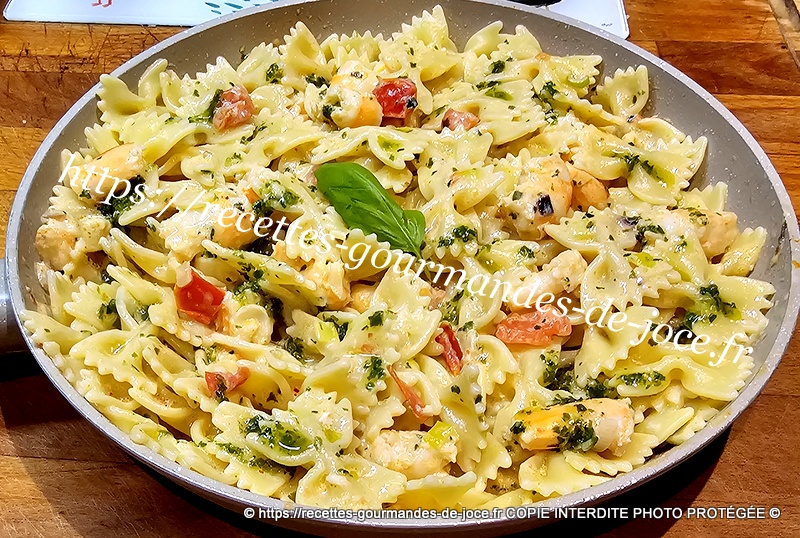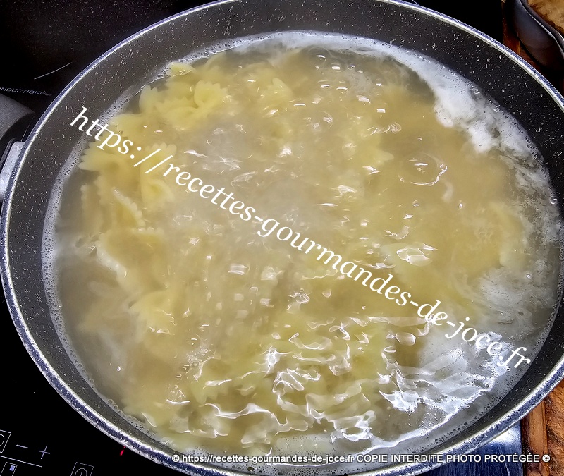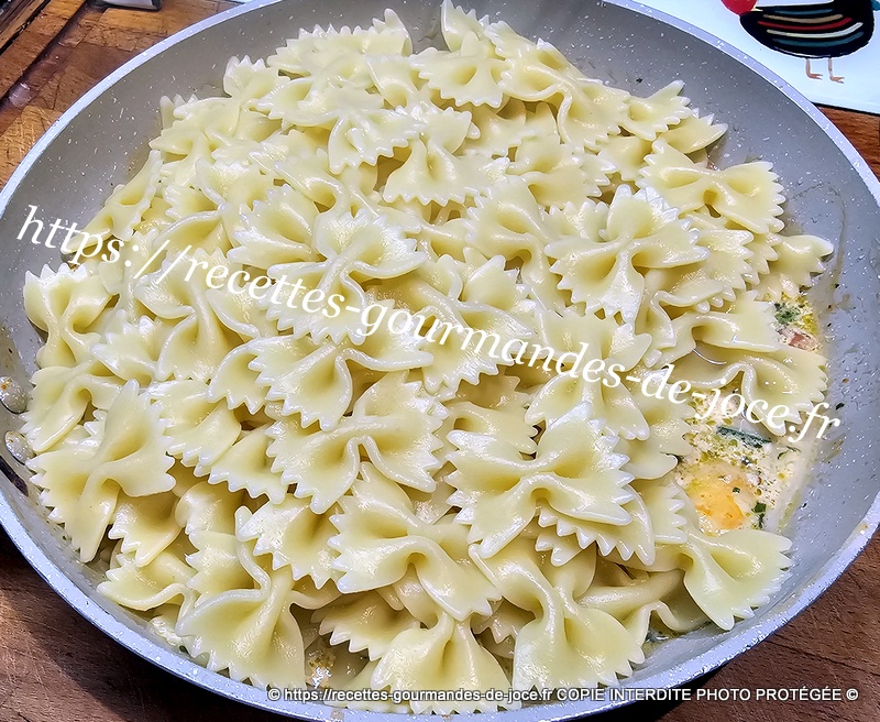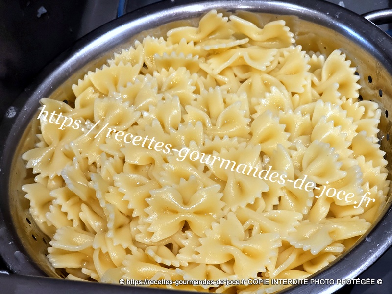 Bien mélanger, ajouter 3 bonnes c à s de sauce au basilic et mélanger. Lorsque les farfalles sont cuites les égoutter.