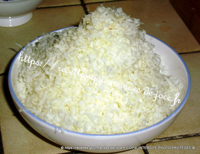 Ajouter les pâtes dans les crevettes et mélanger. Râper le cantal.