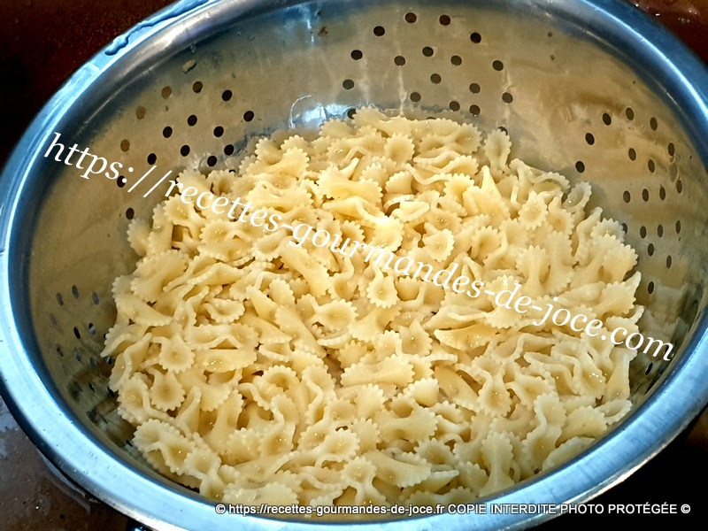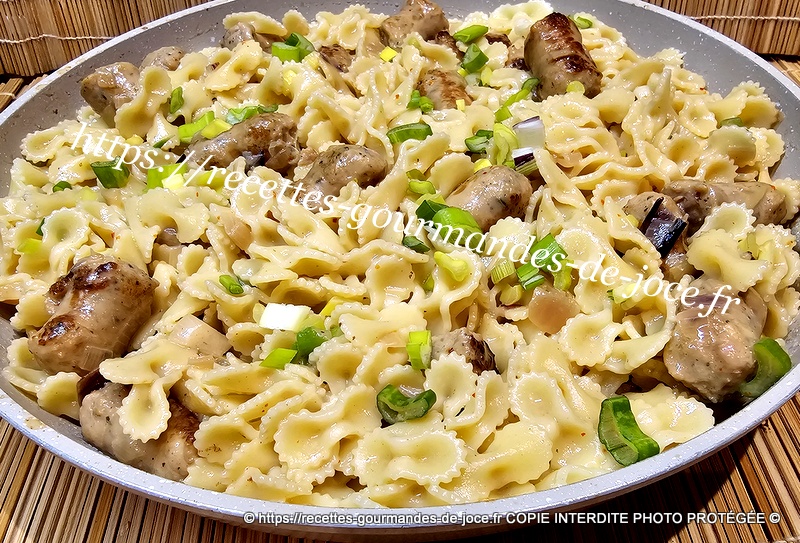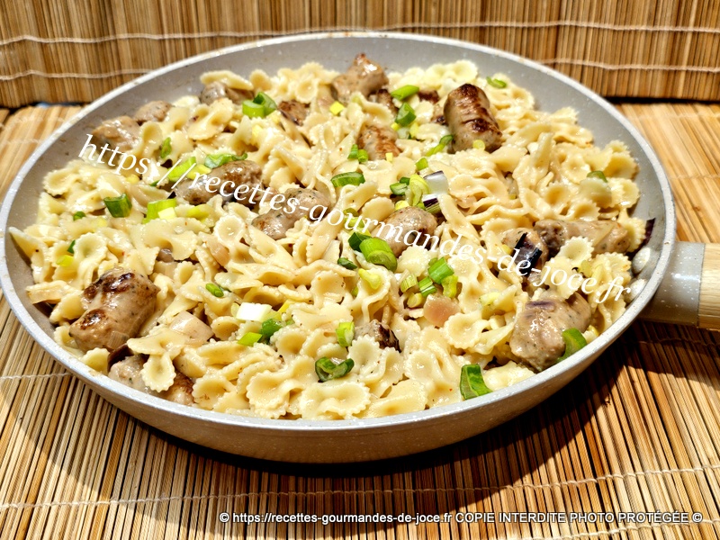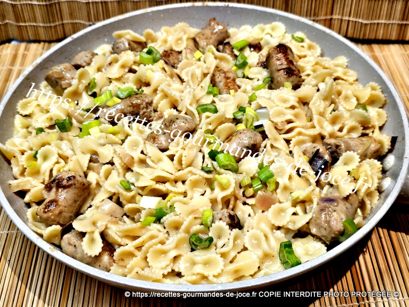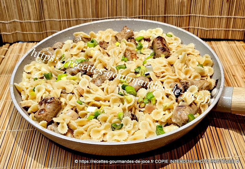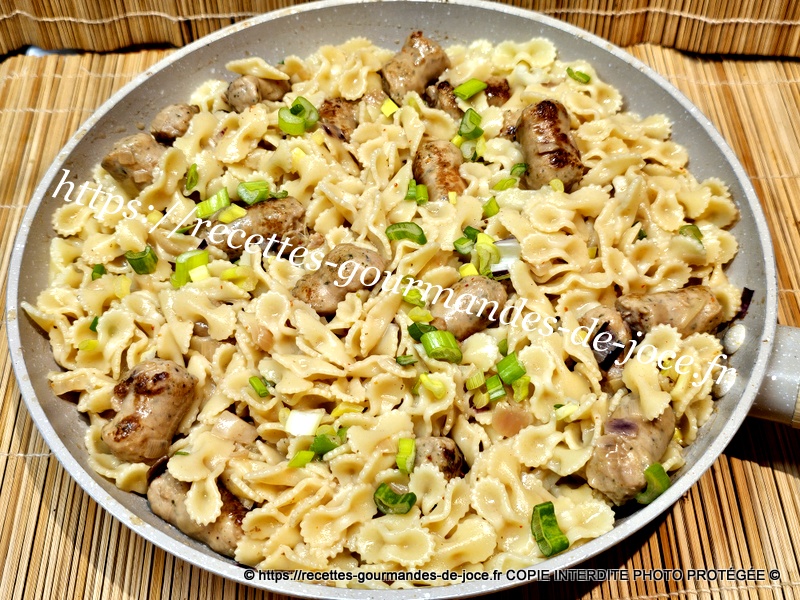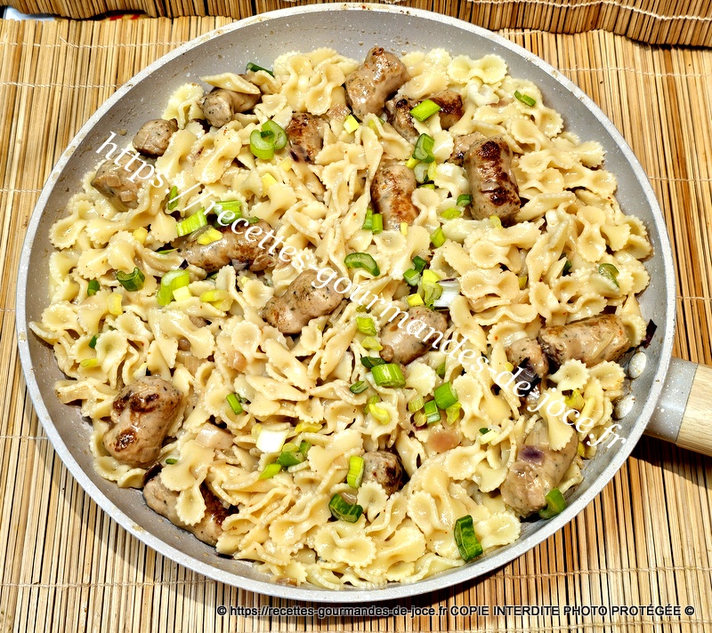 Lorsque les pâtes sont cuites les égoutter et les verser dans les saucisses, mélanger et rectifier au besoin l’assaisonnement. Servir sans attendre.